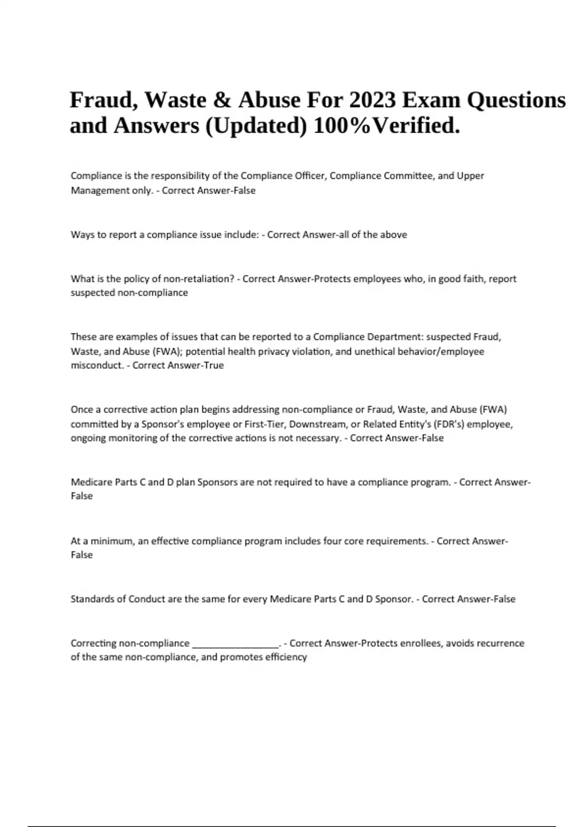 Fraud, Waste & Abuse For 2023 Exam Questions and Answers (Updated) 100%Verified. Compliance is the responsibility of the Compliance Officer, Compliance Committee, and Upper Management only. - Correct Answer-False Ways to report a compliance issue include: - Correct Answer-all of the above What is the policy of non-retaliation? - Correct Answer-Protects employees who, in good faith, report suspected non-compliance These are examples of issues that can be reported to a Compliance Department: suspected Fraud, Waste, and Abuse (FWA); potential health privacy violation, and unethical behavior/employee misconduct. - Correct Answer-True Once a corrective action plan begins addressing non-compliance or Fraud, Waste, and Abuse (FWA) committed by a Sponsor's employee or First-Tier, Downstream, or Related Entity's (FDR's) employee, ongoing monitoring of the corrective actions is not necessary. - Correct Answer-False Medicare Parts C and D plan Sponsors are not required to have a compliance program. - Correct Answer False.