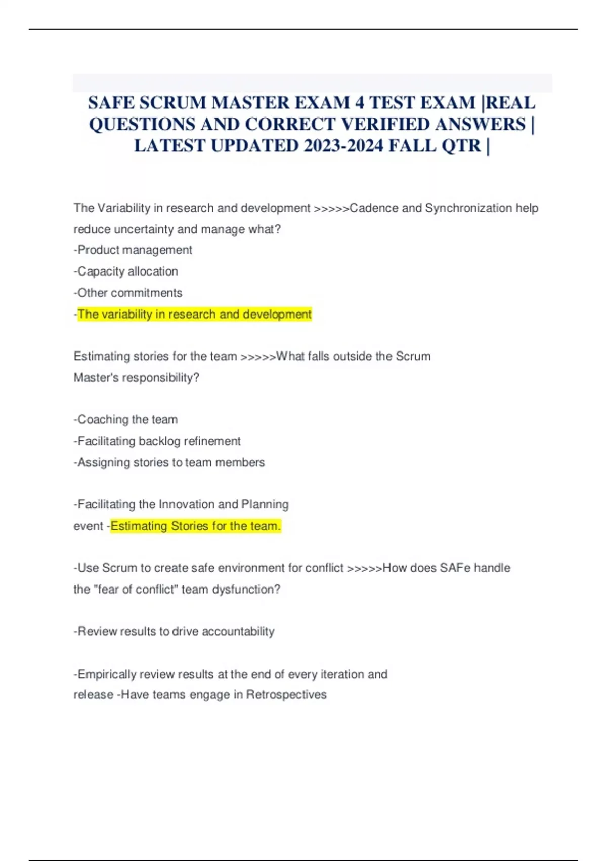 SAFE SCRUM MASTER EXAM 4 TEST EXAM |REAL QUESTIONS AND CORRECT VERIFIED ANSWERS | LATEST UPDATED FALL QTR |