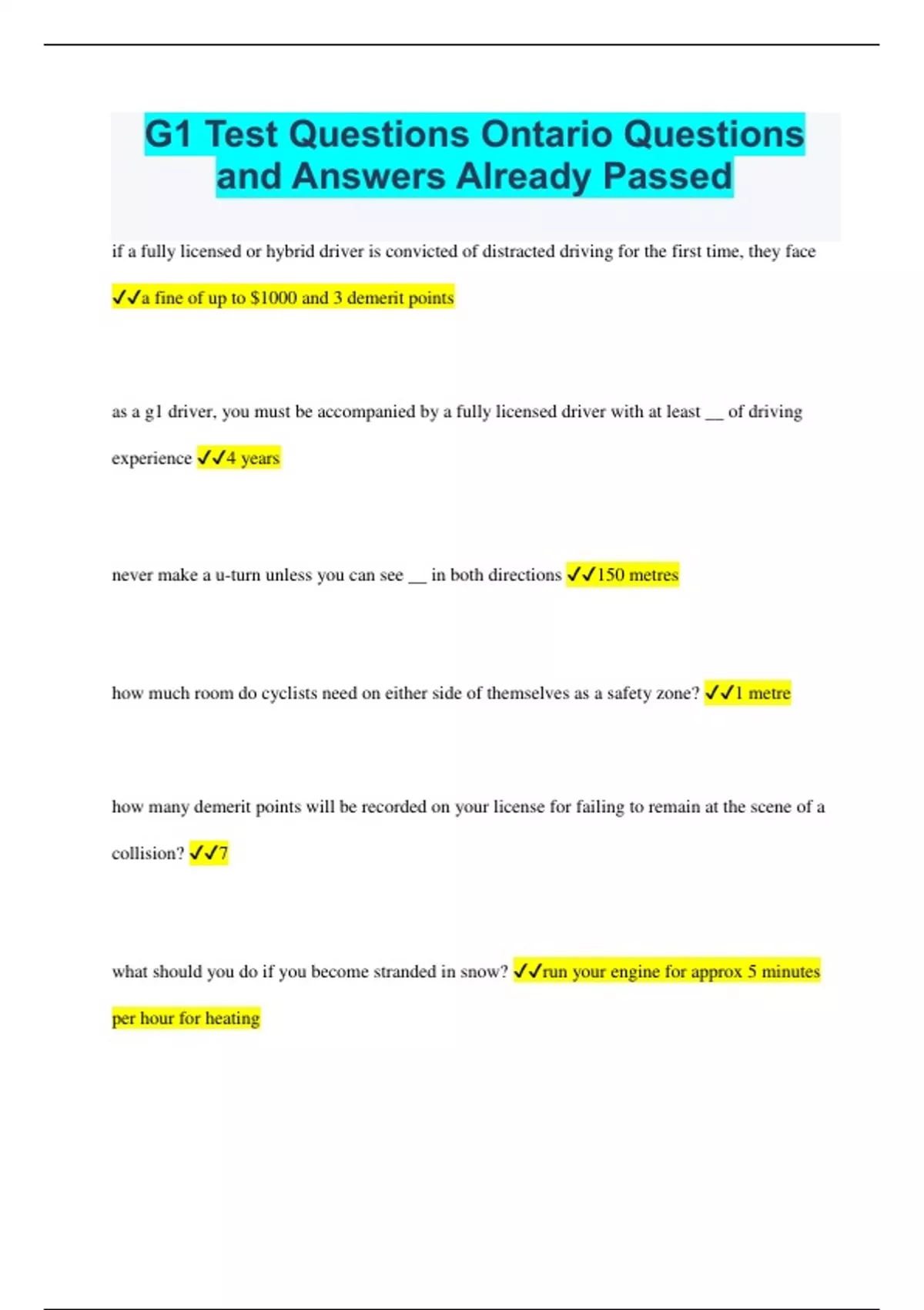G1 Test Questions Ontario Questions and Answers Already Passed