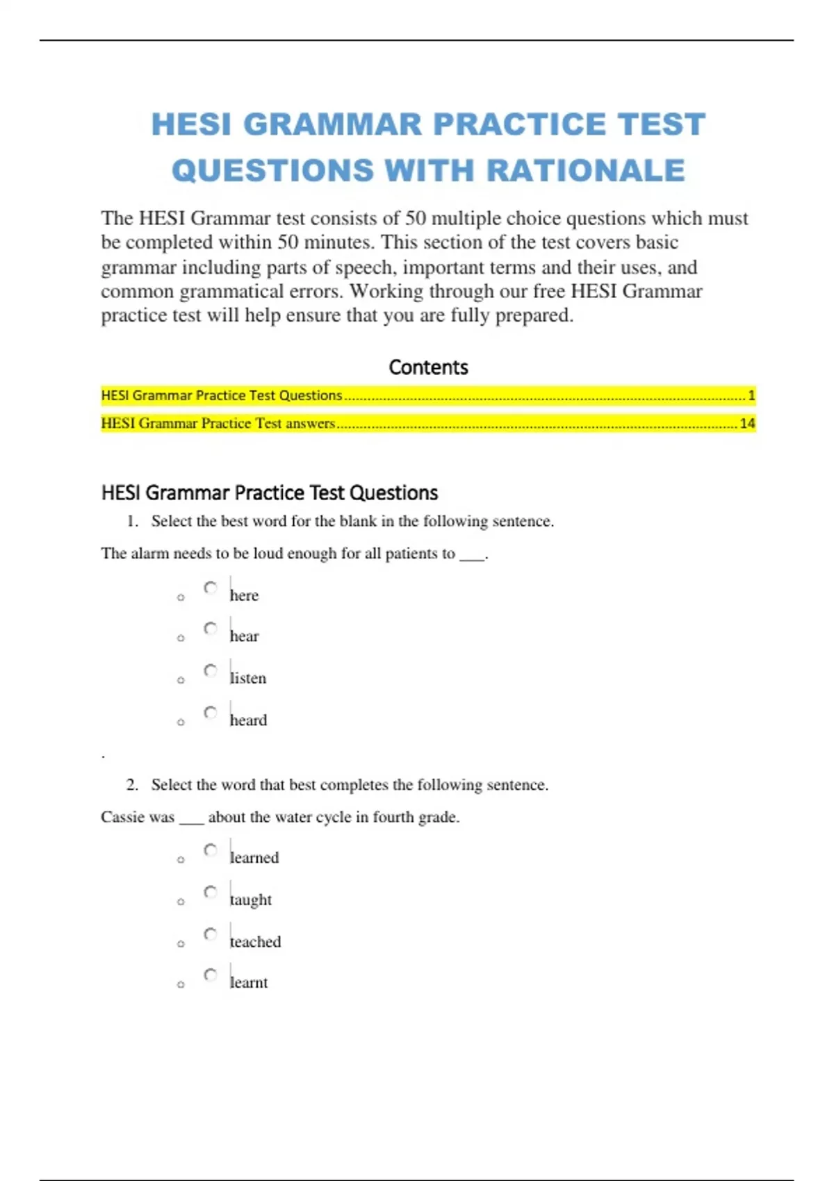 HESI GRAMMAR PRACTICE TEST QUESTIONS WITH RATIONALE The HESI Grammar test consists of 50 multiple choice questions which must be completed within 50 minutes. This section of the test covers basic grammar including parts of speech, important terms and their uses, and common grammatical errors. Working through our free HESI Grammar practice test will help ensure that you are fully prepared.