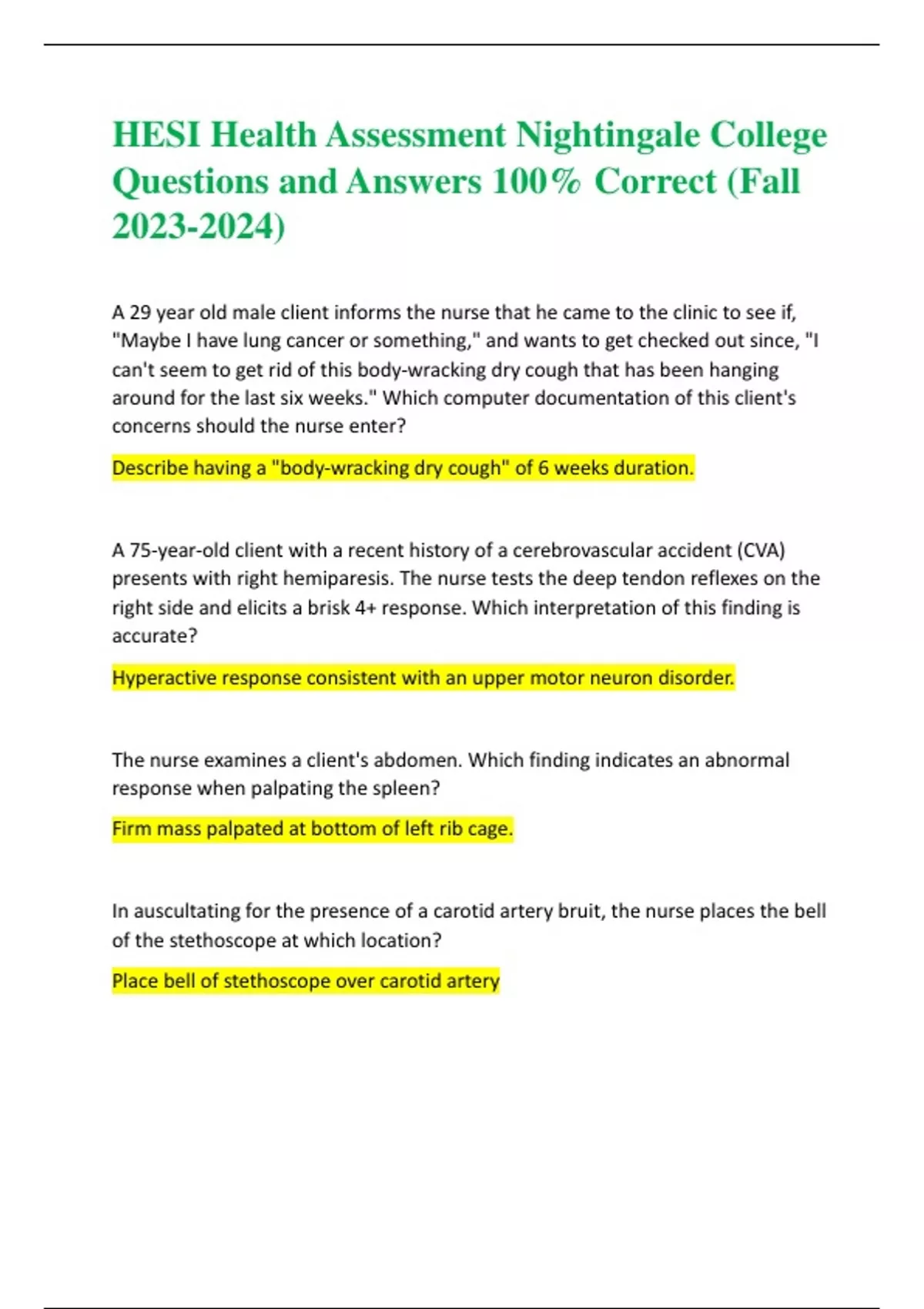 HESI Health Assessment Nightingale College Questions and Answers 100% Correct (Fall 2023-2024 ) A 29 year old male client informs the nurse that he came to the clinic to see if, "Maybe I have lung cancer or something," and wants to get checked out since, "I can't seem to get rid of this body -wracking dry cough that has been hanging around for the last six weeks." Which computer documentation of this client's concerns should the nurse enter? Describe having a "body -wracking dry cough" of 6 weeks duration. A 75 -year -old client with a recent history of a cerebrovascular accident (CVA) presents with right hemiparesis. The nurse tests the deep tendon reflexes on the right side and elicits a brisk 4+ response. Which interpretation of this finding is accurate? Hyperactive response consistent with an upper motor neuron disorder. The nurse examines a client's abdomen. Which finding indicates an abnormal response when palpating the spleen? Firm mass palpated at bottom of left rib cage. In auscultating for the presence of a carotid artery bruit, the nurse places the bell of the stethoscope at which location? Place bell of stethoscope over carotid artery A male client arrives at the clinic for follow -up health assessment after recent antibiotic treatment for pneumonia without hospitalization. Which technique should the nurse implement to assess for adventitious lung sounds? Press the stethoscope's diaphragm firmly on the skin over each lung field. A client with streptococcus pharyngitis reports high fever, difficulty swallowing and a muffled voice. Which complication should the nurse suspect? Peritonsillar abscess. The nurse is obtaining a health history for a client prior to a scheduled cholecystectomy. While interviewing the client, which assessment technique should the nurse use when asking about the client's use of illegal drugs and alcohol? Ask specifically about alcohol, marijuana, cocaine, heroin, and amounts. The nurse applies pressure over an area of the lower abdomen where the client reports pain. The client denies pain upon palpation, but reports pain when the pressure is released. What action should the nurse implement? Notify the healthcare provider of the rebound tenderness. The nurse is assessing an ulcer on a client's lower extremity, which is likely the result of either venous or arterial insufficiency. Which assessment technique should the nurse use to differentiate the pathophysiology causing the ulcer? Observe the specific location and appearance of the ulceration. A. What type of ulcer is this? Which pathophysiology? venous or arterial? Venous leg ulcers usually develop on the inner lower leg, above the medial malleolus. B. What type of ulcer is this? Which pathophysiology? venous or arterial? Arterial wounds occur most often on the foot, in between or at the tips of the toes, at pressure points from foot wear, on the heels and around the lateral malleolus (the bone on the outside of the ankle joint). The nurse is conducting a physical assessment of a young adult. Which information provides the best indication of the individual’s nutritional status? Condition of hair, nails, and skin. The nurse is assessing a healthy adult male during an annual physical examination. The nurse auscultates the client's abdomen and hears gurgling sound every ten seconds. What action should the nurse take in response to this finding? Document this normal bowel sound activity in the record.