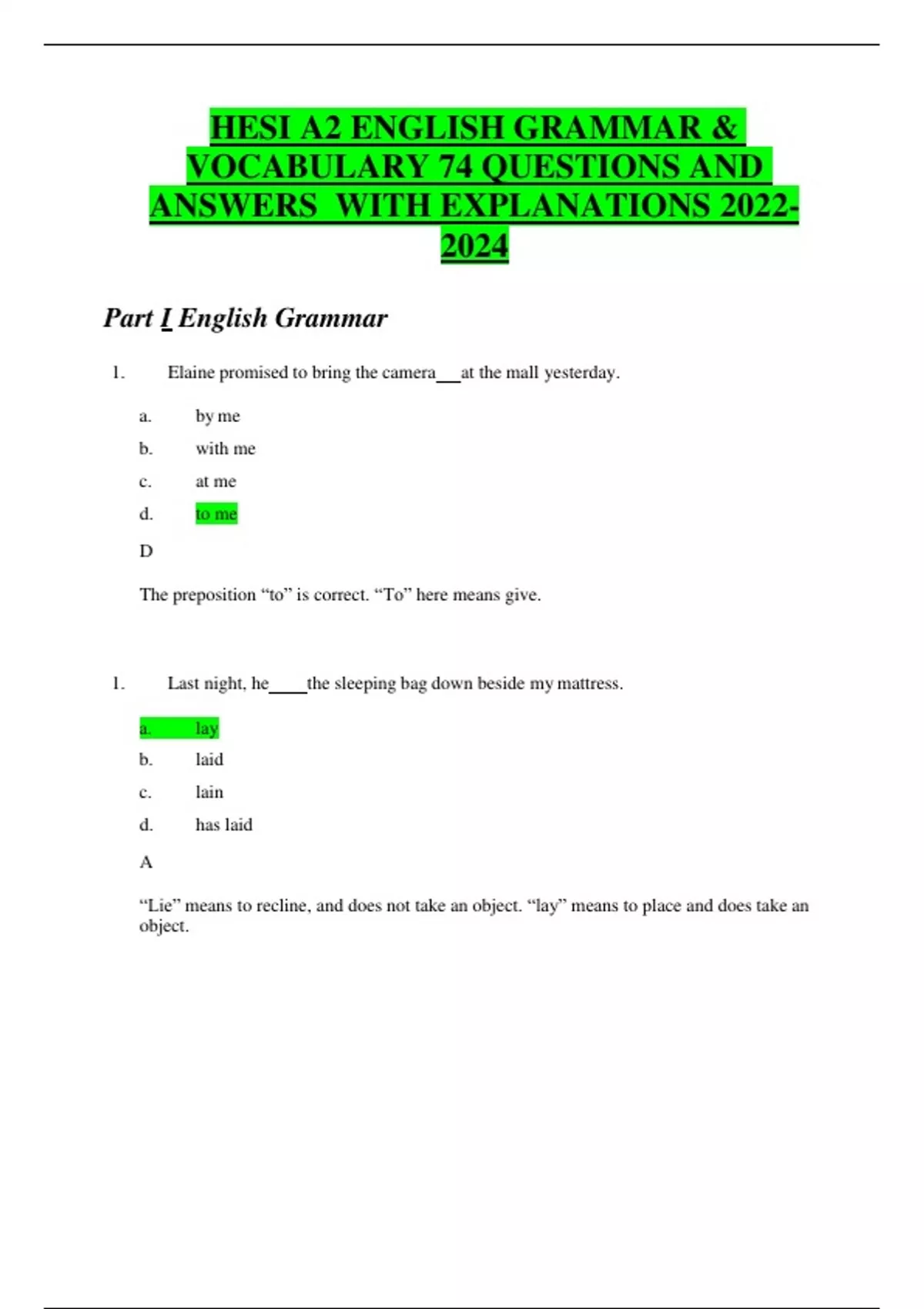 HESI A2 ENGLISH GRAMMAR & VOCABULARY 74+ (QUESTIONS AND ANSWERS WITH EXPLANATIONS) |A GRADE GUARANTEE