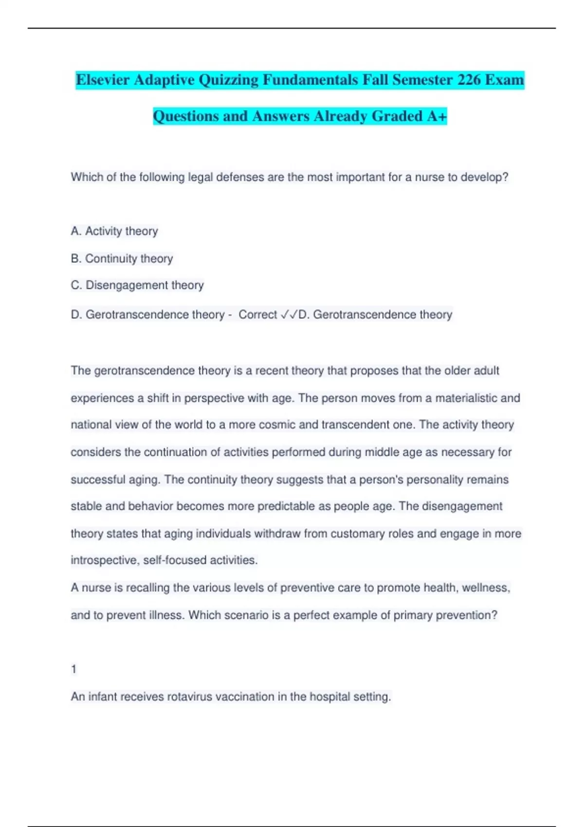 Elsevier Adaptive Quizzing Fundamentals Fall Semester 226 Exam Questions and Answers Already Graded A+ Which of the following legal defenses are the most important for a nurse to develop? A. Activity theory B. Continuity theory C. Disengagement theory D. Gerotranscendence theory - Correct D. Gerotranscendence theory The gerotranscendence theory is a recent theory that proposes that the older adult experiences a shift in perspective with age. The person moves from a materialistic and national view of the world to a more cosmic and transcendent one. The activity theory considers the continuation of activities performed during middle age as necessary for successful aging. The continuity theory suggests that a person's personality remains stable and behavior becomes more predictable as people age. The disengagement theory states that aging individuals withdraw from customary roles and engage in more introspective, self-focused activities. A nurse is recalling the various levels of preventive care to promote health, wellness, and to prevent illness. Which scenario is a perfect example of primary prevention? 1 An infant receives rotavirus vaccination in the hospital setting. 2 An adult in the early stages of Parkinson's disease is advised to perform adequate exercise. 3 An older adult permanently paralyzed due to brain hemorrhage is transferred to a long- term care facility. 4 An older adult with Parkinson's disease is administered carbidopa-levodopa to slow the progression of the disease. - Correct 1. An infant receives rotavirus vaccination in the hospital setting. Primary prevention consists of all health promotion efforts and wellness education activities. An infant receiving the rotavirus vaccination is an example of primary prevention. An adult in the early stages of Parkinson's disease is advised to perform adequate exercises; this is an example of secondary prevention. An older adult permanently paralyzed due to brain hemorrhage is transferred to a long-term care facility. This is an example of tertiary prevention. An older adult with Parkinson's disease is administered carbidopa-levodopa to slow the progression of the disease. This is an example of secondary prevention