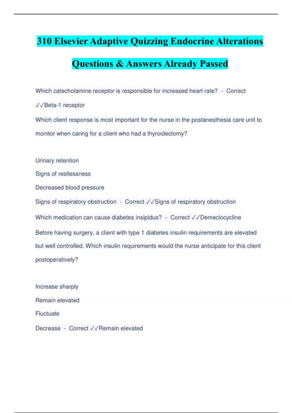 310 Elsevier Adaptive Quizzing Endocrine Alterations Questions & Answers Already Passed Which catecholamine receptor is responsible for increased heart rate? - Correct Beta-1 receptor Which client response is most important for the nurse in the postanesthesia care unit to monitor when caring for a client who had a thyroidectomy? Urinary retention Signs of restlessness Decreased blood pressure Signs of respiratory obstruction - Correct Signs of respiratory obstruction Which medication can cause diabetes insipidus? - Correct Demeclocycline Before having surgery, a client with type 1 diabetes insulin requirements are elevated but well controlled. Which insulin requirements would the nurse anticipate for this client postoperatively? Increase sharply Remain elevated Fluctuate Decrease - Correct Remain elevated