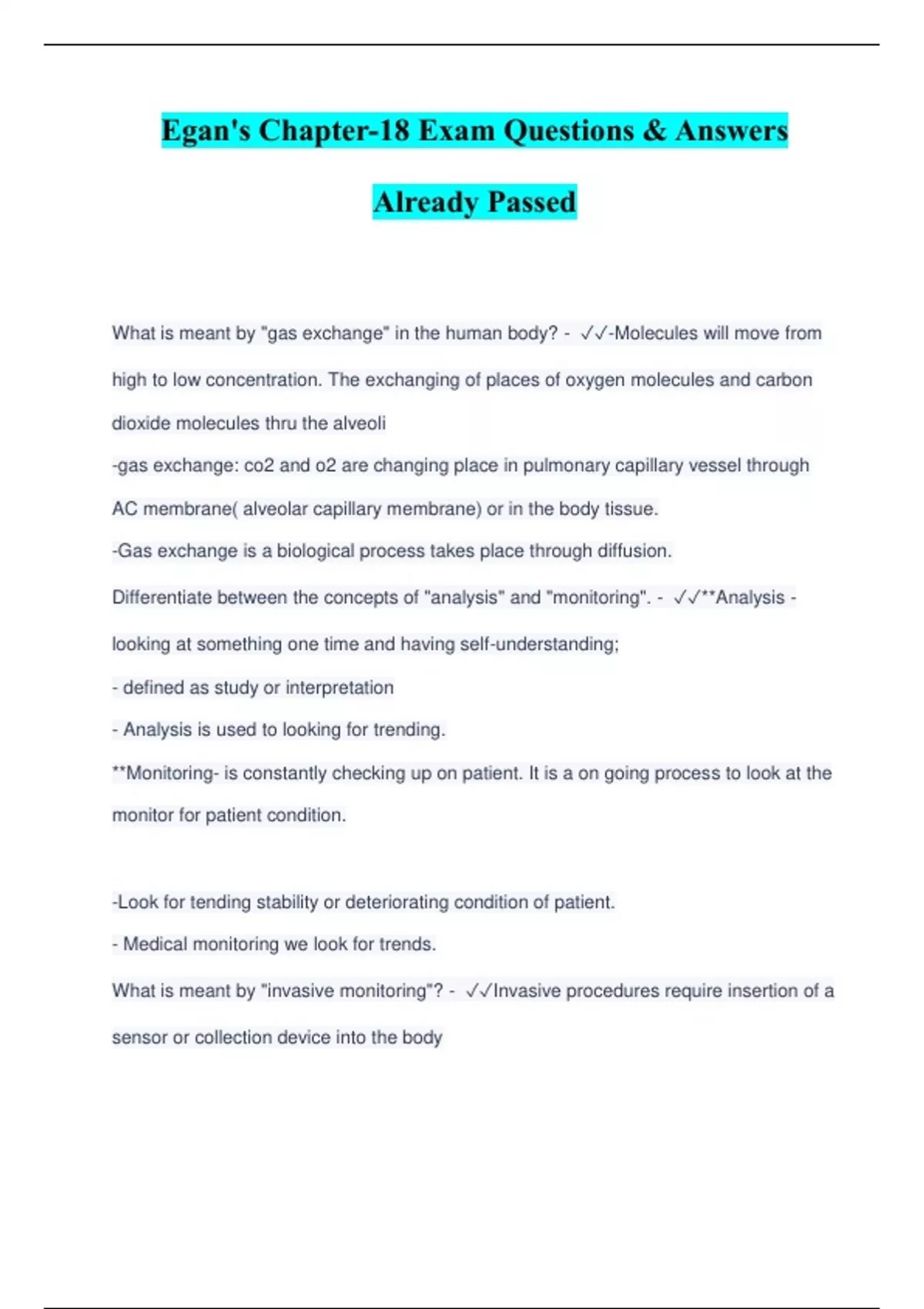 Egan's Chapter-18 Exam Questions & Answers Already Passed What is meant by "gas exchange" in the human body? - -Molecules will move from high to low concentration. The exchanging of places of oxygen molecules and carbon dioxide molecules thru the alveoli -gas exchange: co2 and o2 are changing place in pulmonary capillary vessel through AC membrane( alveolar capillary membrane) or in the body tissue. -Gas exchange is a biological process takes place through diffusion. Differentiate between the concepts of "analysis" and "monitoring". - **Analysis - looking at something one time and having self-understanding; - defined as study or interpretation - Analysis is used to looking for trending. **Monitoring- is constantly checking up on patient. It is a on going process to look at the monitor for patient condition. -Look for tending stability or deteriorating condition of patient. - Medical monitoring we look for trends. What is meant by "invasive monitoring"? - Invasive procedures require insertion of a sensor or collection device into the body
