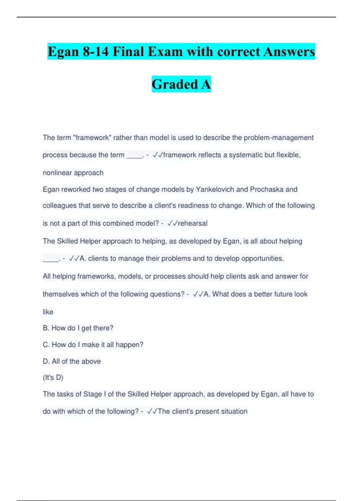 Egan 8-14 Final Exam with correct Answers Graded A The term "framework" rather than model is used to describe the problem-management process because the term ____. - framework reflects a systematic but flexible, nonlinear approach Egan reworked two stages of change models by Yankelovich and Prochaska and colleagues that serve to describe a client's readiness to change. Which of the following is not a part of this combined model? - rehearsal The Skilled Helper approach to helping, as developed by Egan, is all about helping ____. - A. clients to manage their problems and to develop opportunities. All helping frameworks, models, or processes should help clients ask and answer for themselves which of the following questions? - A. What does a better future look like B. How do I get there? C. How do I make it all happen? D. All of the above (It's D) The tasks of Stage I of the Skilled Helper approach, as developed by Egan, all have to do with which of the following? - The client's present situation
