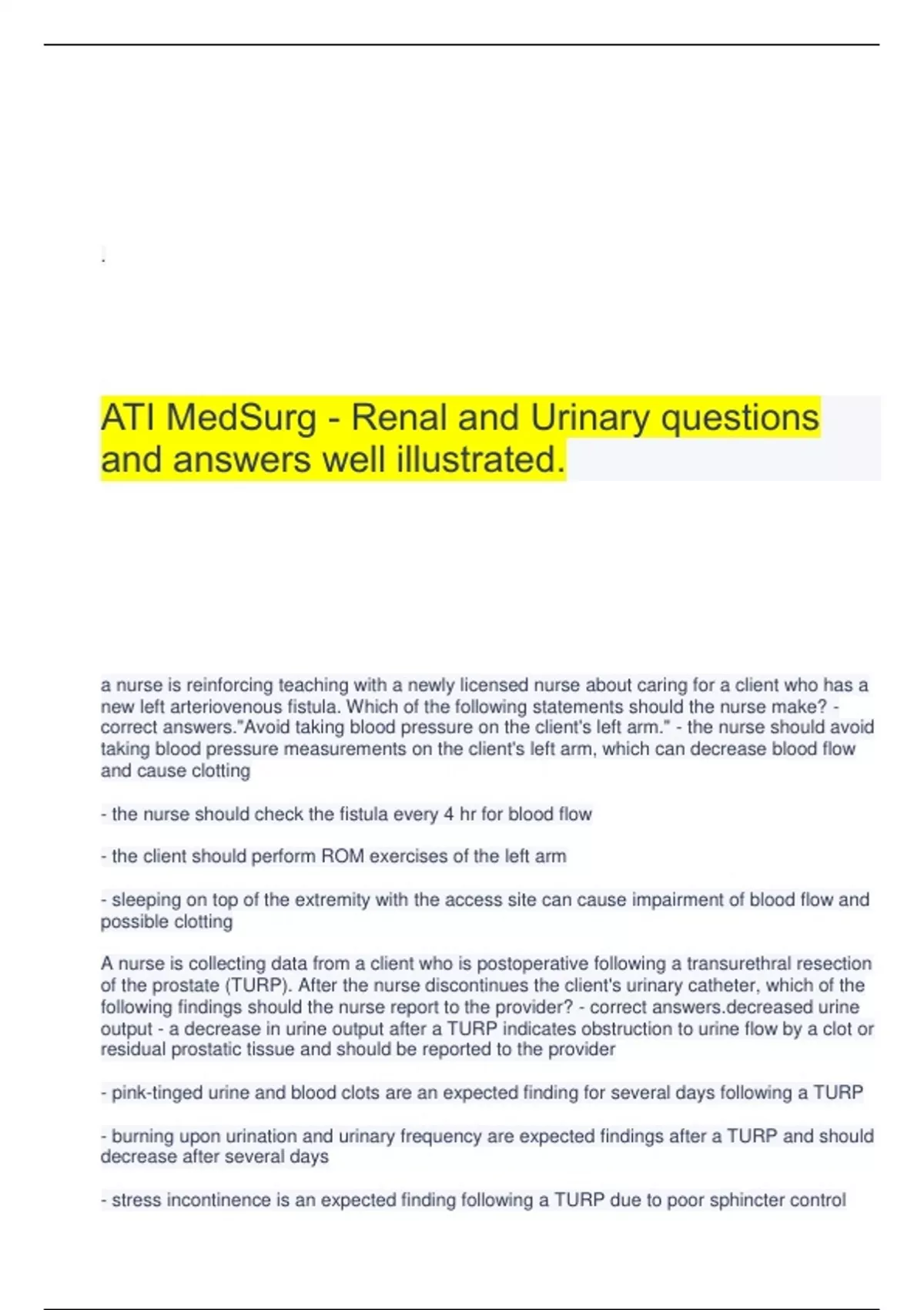 ATI MedSurg - Renal and Urinary questions and answers well illustrated. a nurse is reinforcing teaching with a newly licensed nurse about caring for a client who has a new left arteriovenous fistula. Which of the following statements should the nurse make? - correct answers."Avoid taking blood pressure on the client's left arm." - the nurse should avoid taking blood pressure measurements on the client's left arm, which can decrease blood flow and cause clotting - the nurse should check the fistula every 4 hr for blood flow - the client should perform ROM exercises of the left arm - sleeping on top of the extremity with the access site can cause impairment of blood flow and possible clotting A nurse is collecting data from a client who is postoperative following a transurethral resection of the prostate (TURP). After the nurse discontinues the client's urinary catheter, which of the following findings should the nurse report to the provider? - correct ased urine output - a decrease in urine output after a TURP indicates obstruction to urine flow by a clot or residual prostatic tissue and should be reported to the provider - pink-tinged urine and blood clots are an expected finding for several days following a TURP - burning upon urination and urinary frequency are expected findings after a TURP and should decrease after several days - stress incontinence is an expected finding following a TURP due to poor sphincter control a nurse is reinforcing teaching with a client who has chronic kidney disease (CKD). Which of the following instructions should the nurse include? - correct fluid intake - clients with CKD should limit fluid intake to prevent hypervolemia, or excessive fluid overload - a client who has CKD should increase caloric intake so that the body can use protein for protein synthesis instead of energy consumption. Using protein for energy can lead to a negative nitrogen balance and malnutrition - a client who has CKD should limit phosphorus intake because the kidney are unable to excrete it - a client who