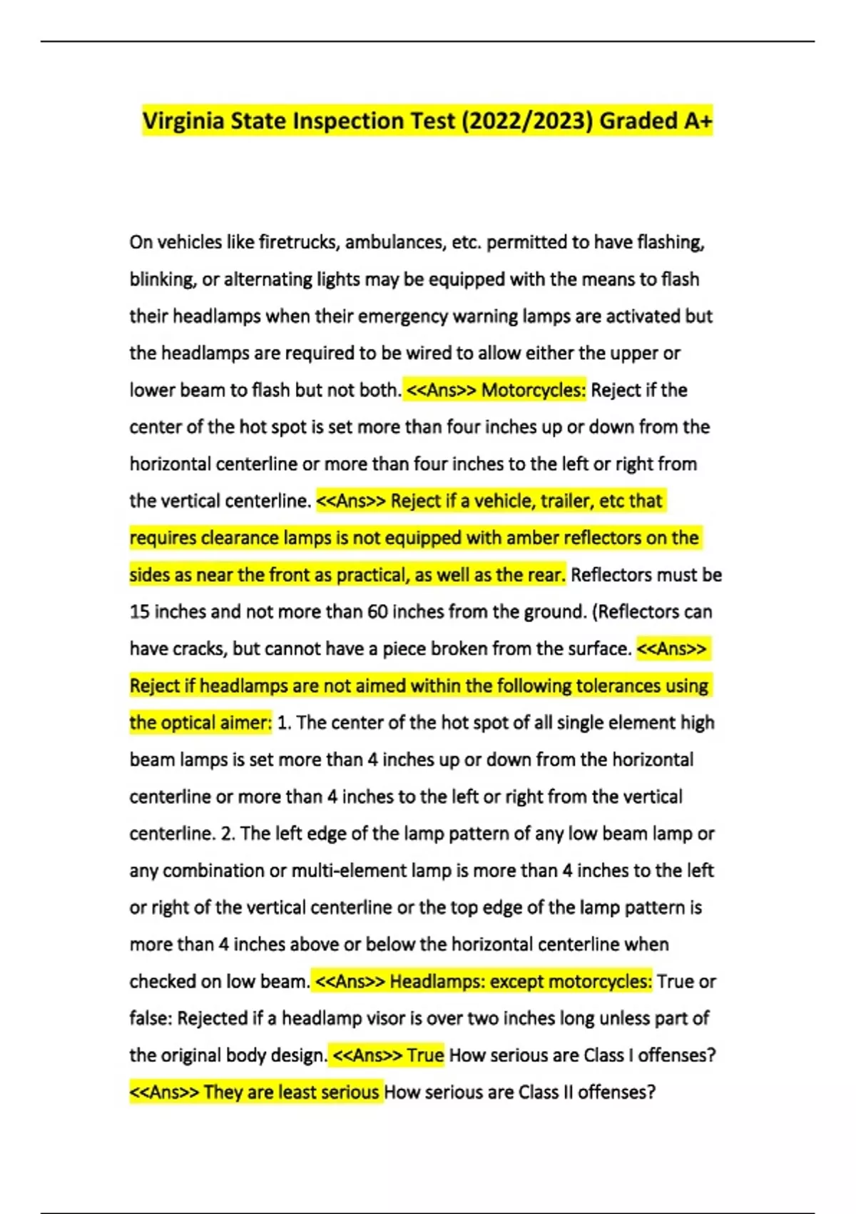 On vehicles like firetrucks, ambulances, etc. permitted to have flashing, blinking, or alternating lights may be equipped with the means to flash their headlamps when their emergency warning lamps are activated but the headlamps are required to be wired to allow either the upper or lower beam to flash but not both. <<Ans>> Motorcycles: Reject if the center of the hot spot is set more than four inches up or down from the horizontal centerline or more than four inches to the left or right from the vertical centerline. <<Ans>> Reject if a vehicle, trailer, etc that requires clearance lamps is not equipped with amber reflectors on the sides as near the front as practical, as well as the rear. Reflectors must be 15 inches and not more than 60 inches from the ground. (Reflectors can have cracks, but cannot have a piece broken from the surface. <<Ans>> Reject if headlamps are not aimed within the following tolerances using the optical aimer: 1. The center of the hot spot of all single element high beam lamps is set more than 4 inches up or down from the horizontal centerline or more than 4 inches to the left or right from the vertical centerline. 2. The left edge of the lamp pattern of any low beam lamp or any combination or multi-element lamp is more than 4 inches to the left or right of the vertical centerline or the top edge of the lamp pattern is more than 4 inches above or below the horizontal centerline when checked on low beam. <<Ans>> Headlamps: except motorcycles: True or false: Rejected if a headlamp visor is over two inches long unless part of the original body design. <<Ans>> True How serious are Class I offenses? <<Ans>> They are least serious How serious are Class II offenses? <<Ans>> They are very serious but are not a cause of accident or injury. How serious are Class III offenses? <<Ans>> They are more severe, are most critical from a safety viewpoint, and could cause a crash. How serious are Class IV offenses? <<Ans>> They are violations most serious and are considered so important to the credibility integrity and of the Inspection Program. What are disciplinary actions for Class I offenses? <<Ans>> 1st offense: Verbal counseling 2nd: Written reprimand 3rd: Suspension of 15 - 30 days Offenses remain active for 24 months What are disciplinary actions for Class II offenses? <<Ans>> 1st offense: Verbal counseling 2nd: Written reprimand 3rd: Suspension of 30 - 60 days Offenses remain active for 24 months