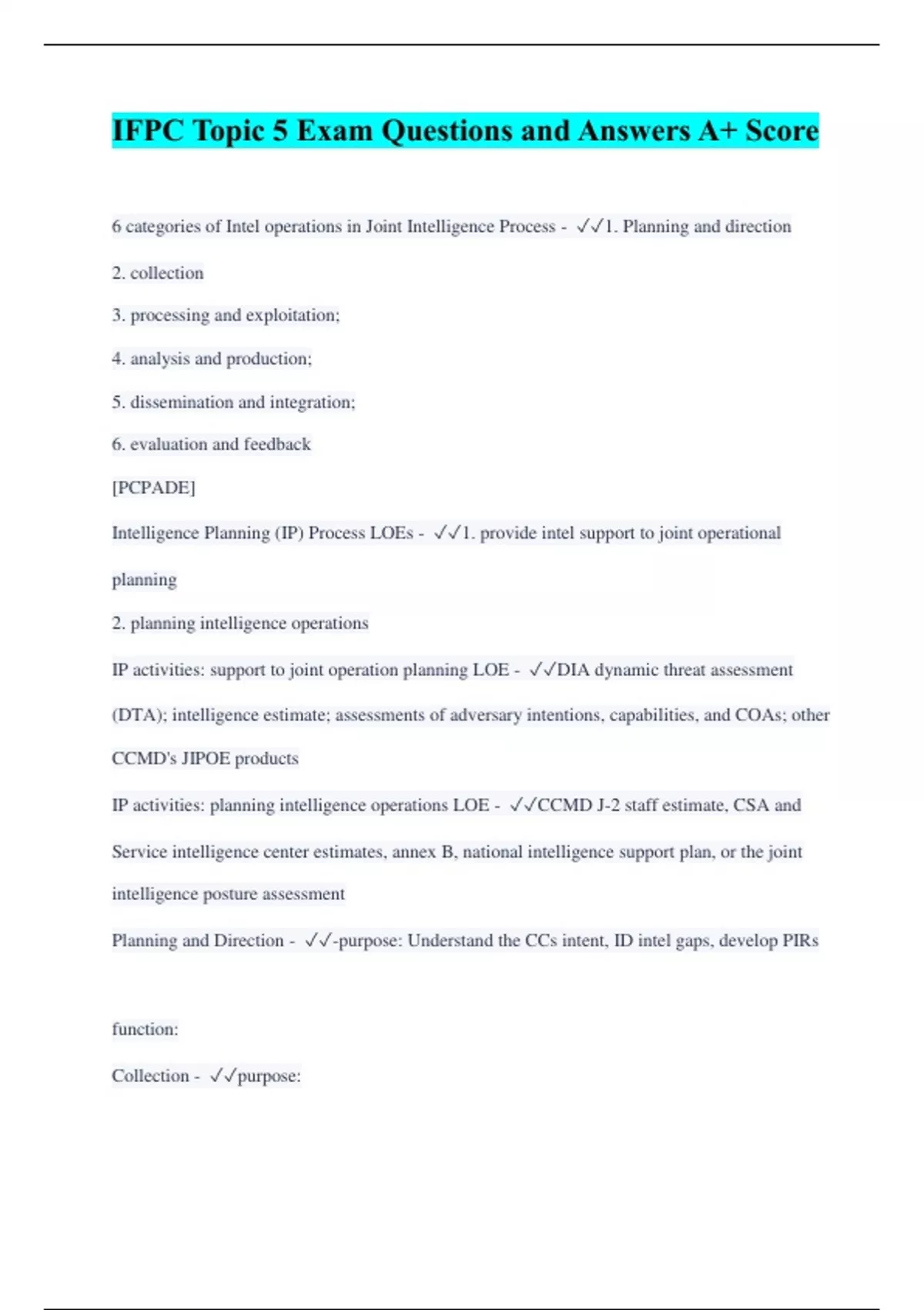 IFPC Topic 5 Exam Questions and Answers A+ Score 6 categories of Intel operations in Joint Intelligence Process - 1. Planning and direction 2. collection 3. processing and exploitation; 4. analysis and production; 5. dissemination and integration; 6. evaluation and feedback [PCPADE] Intelligence Planning (IP) Process LOEs - 1. provide intel support to joint operational planning 2. planning intelligence operations IP activities: support to joint operation planning LOE - DIA dynamic threat assessment (DTA); intelligence estimate; assessments of adversary intentions, capabilities, and COAs; other CCMD's JIPOE products IP activities: planning intelligence operations LOE - CCMD J-2 staff estimate, CSA and Service intelligence center estimates, annex B, national intelligence support plan, or the joint intelligence posture assessment Planning and Direction - -purpose: Understand the CCs intent, ID intel gaps, develop PIRs function: Collection - purpose: