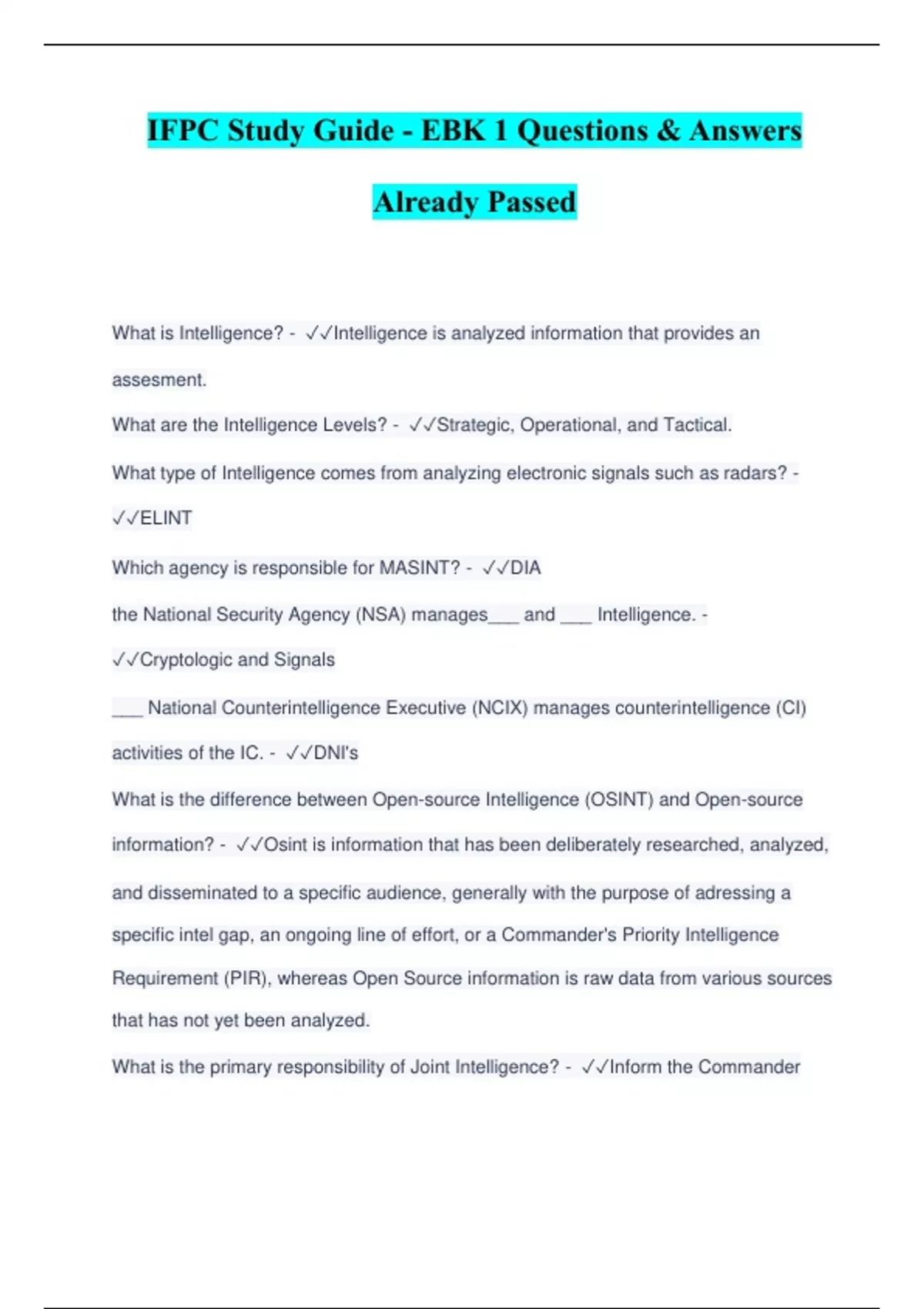 IFPC Study Guide - EBK 1 Questions & Answers Already Passed What is Intelligence? - Intelligence is analyzed information that provides an assesment. What are the Intelligence Levels? - Strategic, Operational, and Tactical. What type of Intelligence comes from analyzing electronic signals such as radars? - ELINT Which agency is responsible for MASINT? - DIA the National Security Agency (NSA) manages___ and ___ Intelligence. - Cryptologic and Signals ___ National Counterintelligence Executive (NCIX) manages counterintelligence (CI) activities of the IC. - DNI's What is the difference between Open-source Intelligence (OSINT) and Open-source information? - Osint is information that has been deliberately researched, analyzed, and disseminated to a specific audience, generally with the purpose of adressing a specific intel gap, an ongoing line of effort, or a Commander's Priority Intelligence Requirement (PIR), whereas Open Source information is raw data from various sources that has not yet been analyzed. What is the primary responsibility of Joint Intelligence? - Inform the Commander