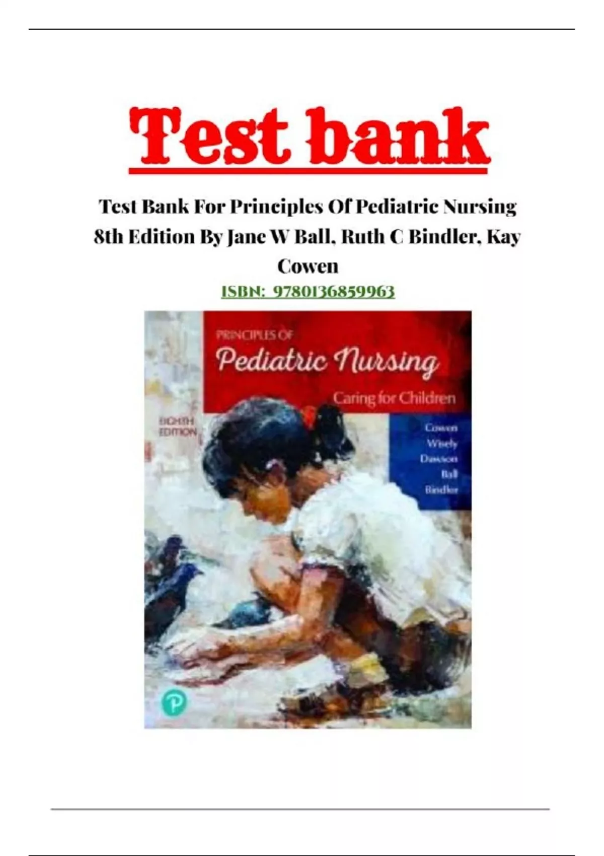 Test bank For Principles of Pediatric Nursing 8th Edition Caring for Children by Kay Cowen; Laura Wisely; Robin Dawson; Jane Ball; Ruth Bindler 9963, 8 1 Contemporary Child Health Nursing 2 Culture and the Family 3 Genetic and Genomic Influences in Child Health 4 Growth and Development 5 Infant, Child, and Adolescent Nutrition 6 Pediatric Assessment 7 Introduction to Health Promotion and Maintenance 8 Health Promotion and Maintenance: The Newborn, and the Infant 9 Health Promotion and Maintenance: The Toddler and the Preschooler 10 Health Promotion and Maintenance: The School‐Age Child and the Adolescent 11 Family Assessment and Concepts of Nursing Care in the Community 12 Nursing Considerations for the Child and Family with a Chronic Condition 13 Nursing Considerations for the Hospitalized Child 14 Pain Assessment and Management in Children 15 The Child with a Life‐Threatening Condition and End‐of‐Life Care 16 Social and Environmental Influences on the Child 17 Immunizations and Communicable Diseases 18 The Child with Alterations in Fluid, Electrolyte, and Acid–Base Balance 19 The Child with Alterations in Eye, Ear, Nose, and Throat Function 20 The Child with Alterations in Respiratory Function 21 The Child with Alterations in Cardiovascular Function 22 The Child with Alterations in Immune Function 23 The Child with Alterations in Hematologic Function 24 The Child with Cancer 25 The Child with Alterations in Gastrointestinal Function 26 The Child with Alterations in Genitourinary Function 27 The Child with Alterations in Endocrine Function 28 The Child with Alterations in Neurologic Function 29 The Child with Alterations in Mental Health and Cognitive Function 30 The Child with Alterations in Musculoskeletal Function 31 The Child with Alterations in Skin Integrity