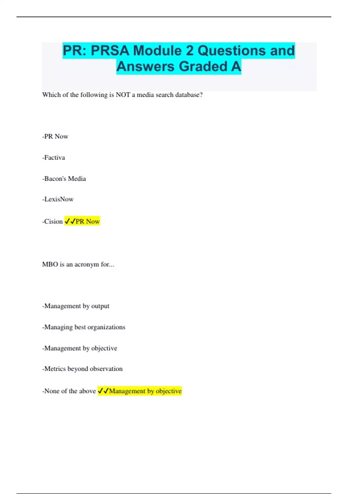 PR: PRSA Module 2 Questions and Answers Graded A Which of the following is NOT a media search database? -PR Now -Factiva -Bacon's Media -LexisNow -Cision PR Now MBO is an acronym for... -Management by output -Managing best organizations -Management by objective -Metrics beyond observation -None of the above Management by objective It is important to determine the purpose of your PR research. Which of the items below is NOT a purpose of research in a campaign? -Causal/functional explanation -Counting the number of mentions -Descriptions -Understanding -Exploration Counting the number of mentions To be successful, the organization has to have a research plan for a campaign that should be revised and adopted -Periodically -Constantly -Continuously -Once a year -Both B and C Both B and C As you start you RPIE process, you need: -Evaluate your previous goals and campaigns -Consult with your overall business and strategy plan -Identify the issues for each of the steps in the RPIE -Do all of the above -Do none of the above Do all of the above Research in the planning phase of a program helps define achievable: -Goals and objectives -Program tactics -Returns on investment -Campaign methods -None of the above Goals and objectives What is the final element in any research program? -Analyzing the data -Reporting the data -Stating the problem -Collecting the data -None of the above Reporting the data The planning stage of the RPIE process is aimed, among other things, to: -Analyze the communicative and interactive footprint of the organization- public relations -Adjust tactics based on real-tome monitoring and evaluation -Complete the company's communication audit and conduct a situation analysis -Examine tactics in terms of effectiveness in real-time monitoring and evaluation -All of the above Analyze the communicative and interactive footprint of the organization- public relations The evaluation stage of the RPIE process includes: -Conducting primary research to evaluate the success of the campaign -Measuring the effectiveness of the overall communication efforts -Auditing and analyzing pre-test and post-test research effort -Gauging the campaign's success against its goals and objectives -All of the above All of the above If you evaluate research from your company's past annual reports, this of secondary research is known as: -Organizational research -Industry research -Stakeholder research -Financial research -Met-analysis -Organizational research What is the difference between primary and secondary research? -Primary is conducted at the beginning of the research phase; secondary is conducted during the evaluation stage -Primary involves direct, initial observation; secondary involves observation over a long period of time -Primary is you conducting new research; secondary is reviewing existing research -Primary is applied by corporations; secondary is applied by public relations firms -Primary is you conducting new research; secondary is reviewing existing research The PR process follows a four-step model in which____is represented at every step -Evaluation -Action -Planning -Measuring -Research Research What is NOT an advantage of primary? -Unique -Exactly about your issues -Specific to the organization -Inexpensive -All are advantage Inexpensive Which of the following is not considered a qualitative method of data gathering and analysis? -Experimentation -Ethnography -Historical/Archival -Discourse Analysis -Visual Methods Experimentation Propriety research is: -Often published in scholarly journals -Typically sponsored in scholarly journals -Accessible to anyone -Not designed for public consumption -All of the above Not designed for public consumption