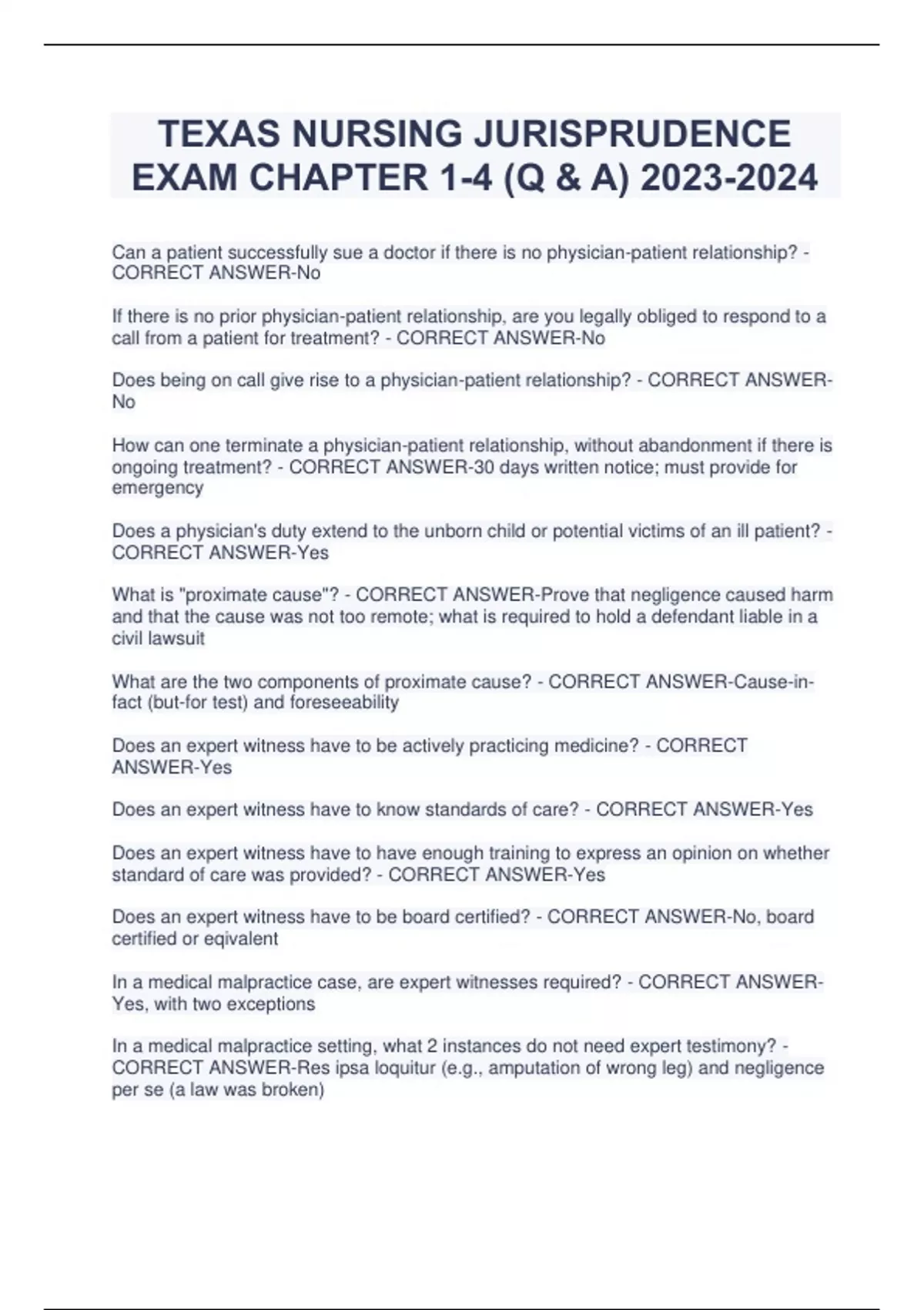 TEXAS NURSING JURISPRUDENCE EXAM CHAPTER 1-4 (Q & A) Can a patient successfully sue a doctor if there is no physician-patient relationship? - CORRECT ANSWER-No If there is no prior physician-patient relationship, are you legally obliged to respond to a call from a patient for treatment? - CORRECT ANSWER-No Does being on call give rise to a physician-patient relationship? - CORRECT ANSWERNo How can one terminate a physician-patient relationship, without abandonment if there is ongoing treatment? - CORRECT ANSWER-30 days written notice; must provide for emergency Does a physician's duty extend to the unborn child or potential victims of an ill patient? - CORRECT ANSWER-Yes What is "proximate cause"? - CORRECT ANSWER-Prove that negligence caused harm and that the cause was not too remote; what is required to hold a defendant liable in a civil lawsuit What are the two components of proximate cause? - CORRECT ANSWER-Cause-infact (but-for test) and foreseeability Does an expert witness have to be actively practicing medicine? - CORRECT ANSWER-Yes Does an expert witness have to know standards of care? - CORRECT ANSWER-Yes Does an expert witness have to have enough training to express an opinion on whether standard of care was provided? - CORRECT ANSWER-Yes Does an expert witness have to be board certified? - CORRECT ANSWER-No, board certified or eqivalent In a medical malpractice case, are expert witnesses required? - CORRECT ANSWERYes, with two exceptions In a medical malpractice setting, what 2 instances do not need expert testimony? - CORRECT ANSWER-Res ipsa loquitur (e.g., amputation of wrong leg) and negligence per se (a law was broken) What are "exemplary damages"? - CORRECT ANSWER-Damages above compensatory designed to punish the defendant and deter the behavior Is there a cap to noneconomic damages? How much? - CORRECT ANSWER-$250,000 for physicians, $500,000 for hospitals Does the cap on noneconomic damage depend on the number of defendants or claimants? - CORRECT ANSWER-No What is "proportional responsibility"? - CORRECT ANSWER-Percentage of liability apportioned according to percentage of fault Can the claimant have part of the proportional responsibility? - CORRECT ANSWERYes If the claimant's proportionate responsibility is more than what %, he/she may not recover damages? - CORRECT ANSWER-If > 50%, no damages awarded How long is the statute of limitations for adults? For minors? - CORRECT ANSWER-2 years; for minors 2 years after becoming 18 years of age By how much can the statute of limitations be extended and how? - CORRECT ANSWER-File complaint—extra 60-day, notice letter extends statute by 75 days What is the statute of limitations for wrongful death? - CORRECT ANSWER-2 years What is the discovery rule? Give examples. - CORRECT ANSWER-Statute does not begin until damage is discovered. For example, a retained sponge that is found 3 years post-op Is there immunity from civil action in emergency cases? - CORRECT ANSWER-Yes, except gross negligence Is there immunity from civil action in volunteer care? - CORRECT ANSWER-Yes, except gross negligence When can a physician be charged with "assault and battery"? - CORRECT ANSWERUn-consented surgery or examination or when exceeding the scope of the consent When can a physician be charged with patient abandonment? - CORRECT ANSWERUnilateral cessation of treatment when continued treatment is necessary What is "strict liability"? - CORRECT ANSWER-Liability that does not depend on actual negligence, but that is based on a breach of a duty to make something safe. This often applies to product liability Are hospitals liable for the actions of a physician? - CORRECT ANSWER-No, unless the hospital employs the physician Who determines in a criminal case if the medical records of a patient should be released? - CORRECT ANSWER-Judge by inspection How many days do you have to release medical records to an attorney? - CORRECT ANSWER-45 days Can medical records be admitted as evidence in court? What are the requirements? - CORRECT ANSWER-Yes, but only with affidavit What are schedule 1, 2, 3, 4, 5 drugs? - CORRECT ANSWER-Schedule 1—no known use (e.g., heroin); schedule 2—very addictive (morphine, cocaine); schedule 3-5—less addictive What are dangerous drugs? - CORRECT ANSWER-Prescription drugs other than schedule 1-5 How many DEA registrations do you need if you prescribe drugs? dispense drugs? - CORRECT ANSWER-One to prescribe; a separate registration for each location where you dispense How often do you renew your DEA license? - CORRECT ANSWER-Every 3 years Can you move your office location and then change your DEA? - CORRECT ANSWERNo, need to change BEFORE move Is a DEA registration sufficient to prescribe drugs in Texas? - CORRECT ANSWER-No, also need Department of Public Safety Bureau of Narcotics and Dangerous Drug registration How often do you renew a DPS license? - CORRECT ANSWER-Yearly Do you have to display the DEA and DPS licenses? - CORRECT ANSWER-Not required by any statute. How many days do you have to notify the DPS of any change in your information (name, address, tel., etc.)? - CORRECT ANSWER-7 days Can you have your DPS suspended and keep your DEA or vice versa? - CORRECT ANSWER-No, they are interconnected For schedules 2-5 drugs, can you just put the number of pills on prescription? - CORRECT ANSWER-No, number and number spelled out Do you have to put intended use on prescription? - CORRECT ANSWER-Yes With how many days of a schedule 2-5 drug can a patient be discharged from the hospital? - CORRECT ANSWER-7 days; only if the drug was already rx in the hospital What kind of prescription pad do you need for schedule 2 drugs? Can you use stickers? - CORRECT ANSWER-Official DPS form; no sticke