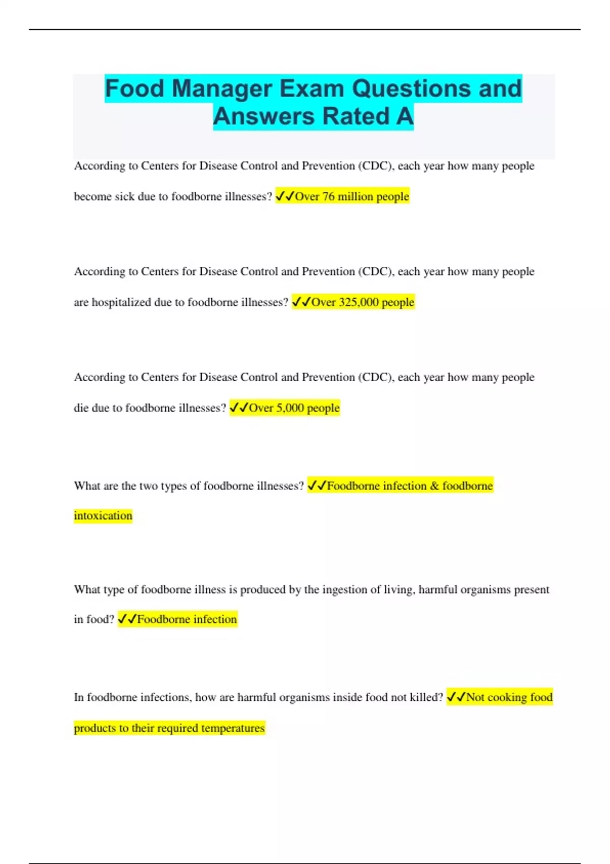 Food Manager Exam Questions and Answers Rated A According to Centers for Disease Control and Prevention (CDC), each year how many people become sick due to foodborne illnesses? Over 76 million people According to Centers for Disease Control and Prevention (CDC), each year how many people are hospitalized due to foodborne illnesses? Over 325,000 people According to Centers for Disease Control and Prevention (CDC), each year how many people die due to foodborne illnesses? Over 5,000 people What are the two types of foodborne illnesses? Foodborne infection & foodborne intoxication What type of foodborne illness is produced by the ingestion of living, harmful organisms present in food? Foodborne infection In foodborne infections, how are harmful organisms inside food not killed? Not cooking food products to their required temperatures What type of foodborne illness has a delayed onset meaning you do not get sick right away? Foodborne infections What are two bacteria most associated with foodborne infection? Salmonella and E. Coli What type of foodborne illness is produced by ingestion of bacterial toxins or excrements that are present in food before it is consumed? Foodborne intoxication What type of foodborne illness may occur from consuming foods that contain chemicals from cleaning agents, pesticides, or certain metals? Foodborne intoxication What type of foodborne illness may occur when leaving potentially hazardous food products at room temperature, exposing it to the Temperature Danger Zone (TDZ)? Foodborne intoxication What are waste or by-products of bacteria? Toxins The symptoms of what type of foodborne illness have a rapid onset, meaning they occur rapidly within a few hours? Foodborne intoxication What are the two bacteria associated with foodborne intoxication? Staphylococcus Aureus and Clostridium Botulinum Poultry should be cooked to an internal temperature of how many degrees and for how many seconds? 165 degrees F for 15 seconds Ground beef should be cooked to an internal temperature of how many degrees for how many seconds? 155 degrees F for 15 seconds Pork should be cooked to an internal temperature of how many degrees for how many seconds? 145 degrees for 15 seconds What is WRSA? Wash, Rinse, Sanitize, Air dry How many seconds do food preparers need to wash their hands for? 20 seconds What are the four groups of people who are considered High R