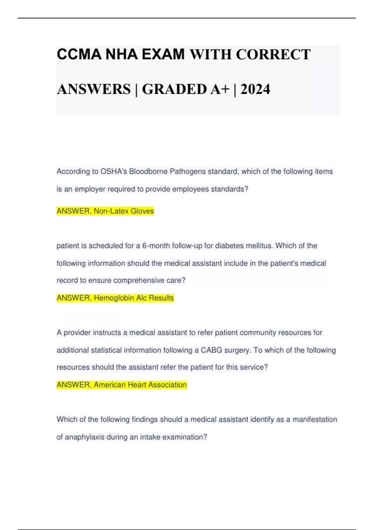 CCMA NHA EXAM WITH CORRECT ANSWERS | GRADED A+ | 2024 According to OSHA's Bloodborne Pathogens standard, which of the following items is an employer required to provide employees standards? ANSWER, Non-Latex Gloves patient is scheduled for a 6-month follow-up for diabetes mellitus. Which of the following information should the medical assistant include in the patient's medical record to ensure comprehensive care? ANSWER, Hemoglobin Alc Results A provider instructs a medical assistant to refer patient community resources for additional statistical information following a CABG surgery. To which of the following resources should the assistant refer the patient for this service? ANSWER, American Heart Association