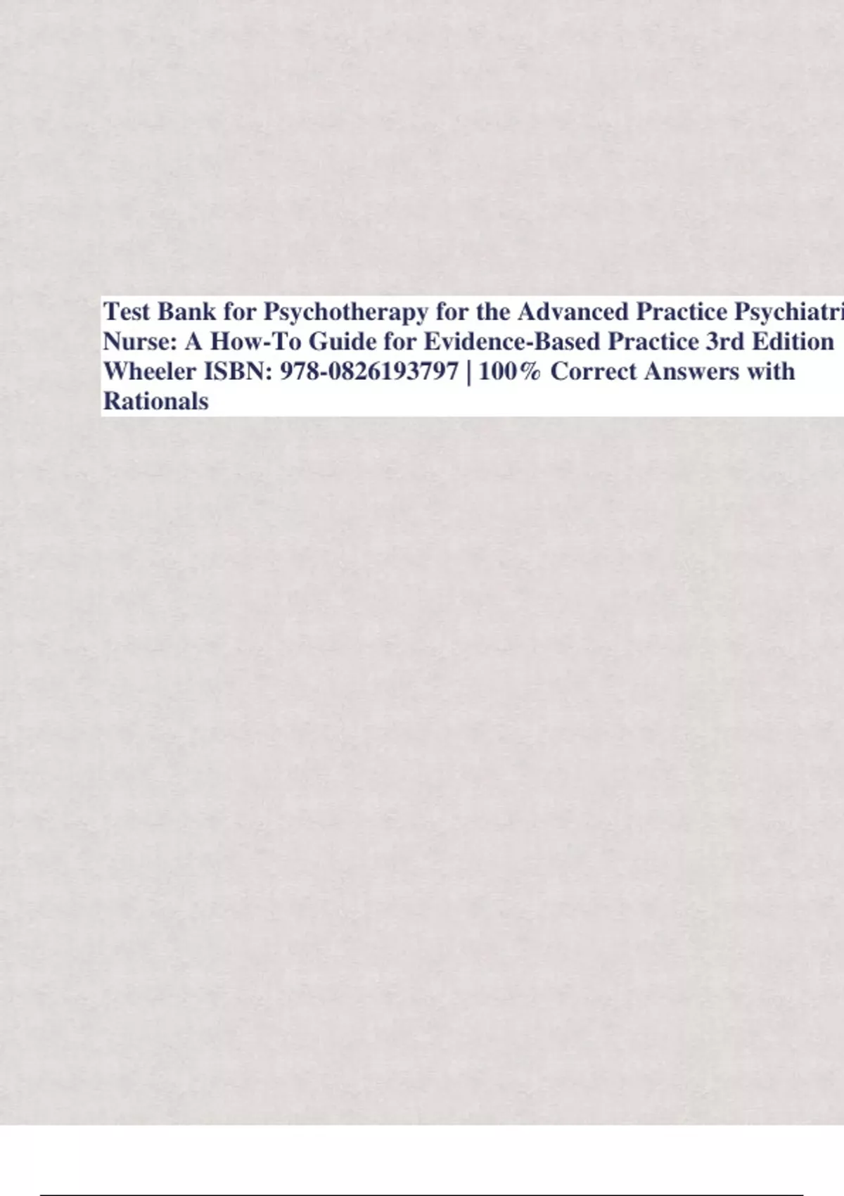 Test Bank for Psychotherapy for the Advanced Practice Psychiatric Nurse: A How-To Guide for Evidence-Based Practice 3rd Edition Wheeler ISBN: 978-0826193797 | 100% Correct Answers with Rationals Course Psychotherapy for the Advanced Practice psychiati Ins