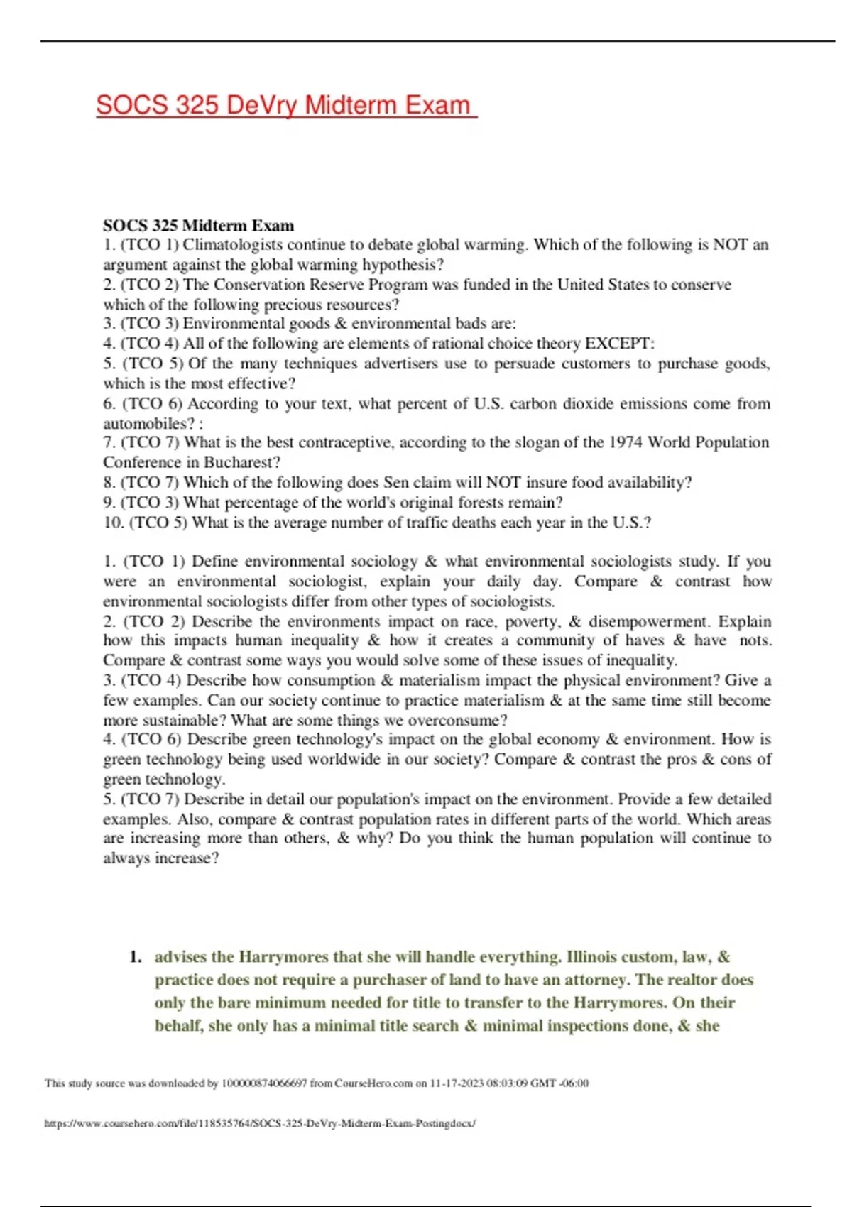 SOCS 325 Week 4 Midterm Grade Details - All Questions Points Received: 5 of 5 Comments: explanations of social life. Which o f the following distinguishes a constructionist perspective on environment problems? Student Answer: Environmental problems need to be understood in terms of the threats posed by society's current ecological relations. There is no difference between the realist & constructionist approaches to environmental problems-they are in agreement. The way we conceptualize & define environmental problems is a key focus. Constructionists do not believe that we have environmental problems, rather the concerns are all constructed by alarmists. Instructor Explanation: Chapter 1, pages 3-4. Points Received: 0 of 5 Comments: Question 3. Question : (TCO 3) The 1995 Nobel Prize in Chemistry was awarded to three scientists whose work led to discovery of the causes for the thinning of the earth's atmosphere by chlorofluorocarbons (CFCs). Which of the following was NOT one of these scientists? Student Answer: Mario Molina Paul Crutzen Sherwood Rowland Aldo Leopold Instructor Explanation: Chapter 1, page 24. Points Received: 5 of 5 Comments: Question 4. Question : (TCO 4) Who is/was the "original affluent society" according to Marshall Sahlins? Student Answer: Hunter gatherers Agrarian pastoralists The aristocracy of Europe & Asia Wealthy Western capitalists Instructor Explanation: Chapter 2, pages 38-39. Points Received: 5 of 5 Comments: Question 5. Question : (TCO 5) The hau of material objects refers to: Student Answer: superstitious belief in animate objects. the utility of material objects that serve our interests. sentimental connections & social relationships embodied in things. the respect we have for tools & technologies created by humans. Instructor Explanation: Chapter 2, pages 46-47. Points Received: 0 of 5 Comments: Question 6. Question : (TCO 6) What has been the result of air quality from strict emission controls? Student Answer: Strict emission controls have resulted in a dramatic improvement in air quality. Strict emission controls are largely ignored thus air quality has dramatically decreased. Strict emission controls have led industrialists to be contrite & to stop polluting. The growth in use of automobiles andtrucks have wiped out much of the gain from emission controls. Instructor Explanation: Chapter 3, page 77. Points Received: 5 of 5 Comments: Question 7. Question : (TCO 7) According to Malthus, population grows: Student Answer: incrementally, in fits & starts. at a steady, measured pace. arithmetically. exponentially. Instructor Explanation: Chapter 4, page 86. Points Received: 5 of 5 Comments: Question 8. Question : (TCO 7) Which of the following does Sen claim will NOT insure food availability? Student Answer: Dependable food imports Land reform Steady employment Democracy Instructor Explanation: Chapter 4, pages 97-98. Points Received: 5 of 5 Comments: Question 9. Question : (TCO 3) What percentage of the world's original forests remain? Student Answer: 100% 68% 50% 0% Instructor Explanation: Chapter 1, Pages 15-16 Points Received: 5 of 5 Comments: Question 10. Question : (TCO 5) According to your text, what is the leading cause of death in the U.S. for individuals between the ages of 1 & 35? Student Answer: AIDS Youth-on-youth violence Traffic accidents Environmental exposure to toxins Instructor Explanation: Chapter 3, Pages 76-77 Points Received: 5 of 5 Comments: Grading Summary Question Type: # Of Questions: # Correct: Multiple Choice 10 8 Essay 5 N/A Grade Details - All Questions Page: 12 Question Question : (TCO 1) Define environmental sociology & what 1. environmental sociologists study. If you were an environmental sociologist, explain your daily day. Compare & contrast how environmental sociologists differ from other types of sociologists. Student Answer: Environmental sociology is typically defined as the sociological study of societal-environmental interactions, although this definition immediately presents the problem of integrating human cultures with the rest of the environment. Although the focus of the field is the relationship between society & environment in general, environmental sociologists typically place special emphasis on studying the social factors that cause environmental problems, the societal impacts of those problems, & efforts to solve the problems. In addition, considerable attention is paid to the social processes by which certain environmental conditions become socially defined as problems. Although there was sometimes acrimonious debate between the constructivist & realist "camps" within environmental sociology in the 1990s, the two sides have found considerable common ground as both increasingly accept that while most environmental problems have a material reality they nonetheless become known only via human processes such as scientific knowledge, activists' efforts, & media attention. In other words, most environmental problems have a real ontological status despite our knowledge/awareness of them stemming from social processes, processes by which various conditions are constructed as problems by scientists, activists, media & other social actors. Correspondingly, environmental problems must all be understood via social processes, despite any material basis they may have external to humans. This interactiveness is now broadly accepted, but many aspects of the debate continue in contemporary research in the field. Environmental sociology is the field of sociology DEALING with the interactions between societies & their environments. It may focus on the social dimensions of either the natural environment or the human-built environment. An environmental sociologist is a sociologist who STUDIES society-environment interactions such as the environmental movement, how people in societies perceive environmental problems, the relationships between population, health, & the environment, globalization, & the mechanisms behind enviro