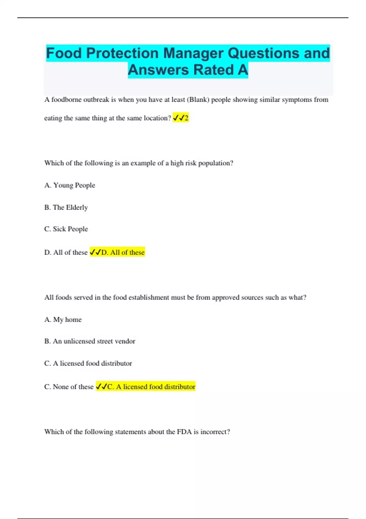Food Protection Manager Questions and Answers Rated A A foodborne outbreak is when you have at least (Blank) people showing similar symptoms from eating the same thing at the same location? 2 Which of the following is an example of a high risk population? A. Young People B. The Elderly C. Sick People D. All of these D. All of these All foods served in the food establishment must be from approved sources such as what? A. My home B. An unlicensed street vendor C. A licensed food distributor C. None of these C. A licensed food distributor Which of the following statements about the FDA is incorrect? A. It writes Food Code B. It insects all food except eggs, poultry, and meat C. Requires a person in charge to become a certified food protection manager D. Does not require a person in charge to be on-site at all times during operating hour D. Does not require a person in charge to be on-site at all times during operating hours A serious foodborne illness that is commonly transmitted by fecal-oral routes is caused by which virus? A. E. Coli B. Yeast C. Hepatitis A D. Mold C. Hepatitis A Under ideal conditions, bacteria can multiply every (blank). 20 Minutes What is the range of temperature for the Danger Zone? 41 - 135 degrees F Which bacteria is associated with contaminated lunch meats and grows at temperatures below 41 degrees? Listeria Which parasite is associated with foodborne illness caused by undercooked pork? Trichinella Which bacteria is associated with foodborne illness caused by undercooked ground beef? Shiga toxin producing E. Coli. What is the main goal for controlling time and temperature? To reduce and prevent growth of bacteria. Toxins produced by pathogens can be easily eliminated by which activity? A. Cooking B. Cooling C. Reheating D. None of these Employees with a headache and a cough who come to work should be restricted to what type of duties? A. Prep Food B. Serve Food C. Stock Food D. Wash