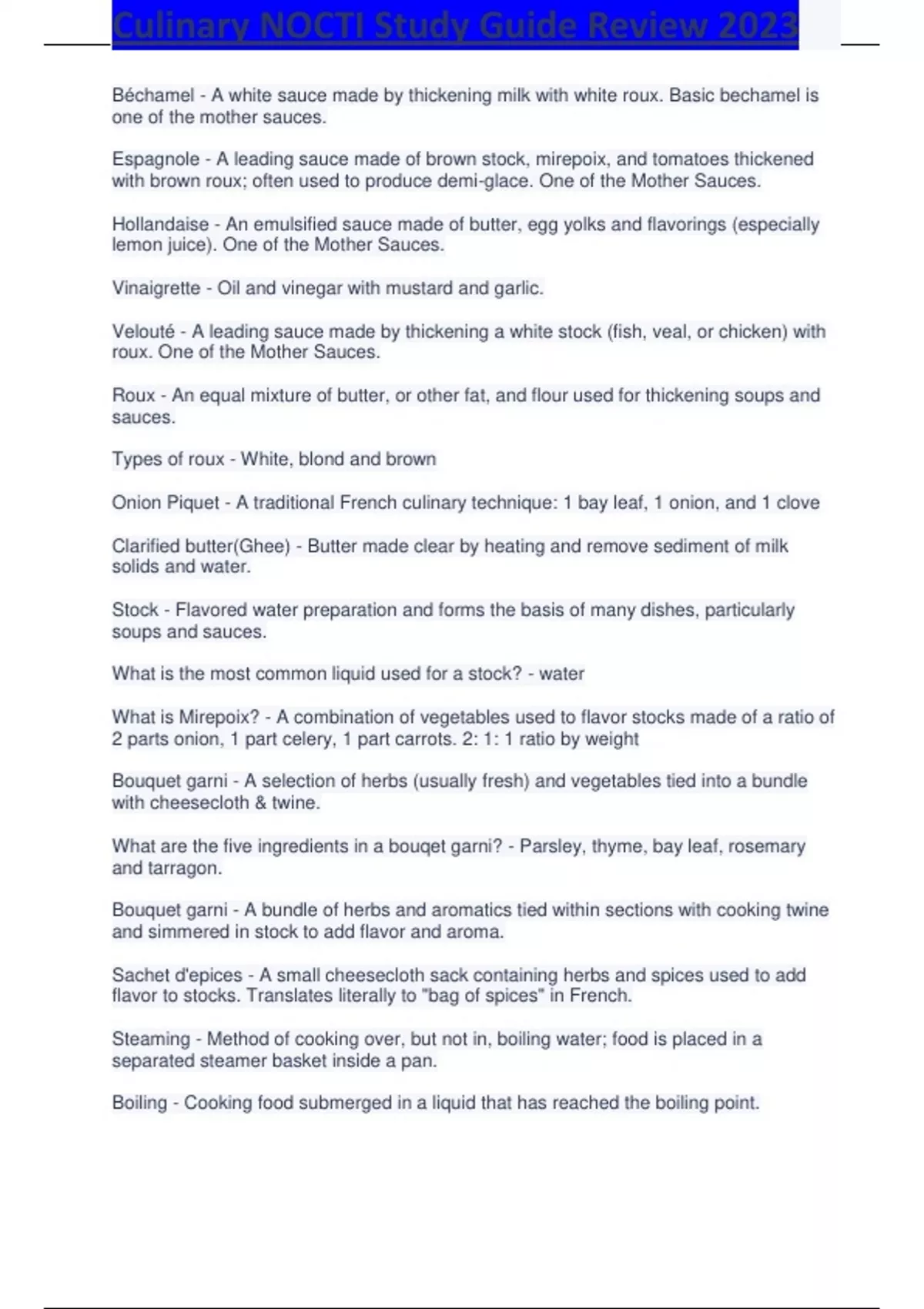 Culinary NOCTI Study Guid e Review 2023 Béchamel - A white sauce made by thickening milk with white roux. Basic bechamel is one of the mother sauces. Espagnole - A leading sauce made of brown stock, mirepoix, and tomatoes thickened with brown roux; often used to produce demi -glace. One of the Mother Sauces. Hollandaise - An emulsified sauce made of butter, egg yolks and flavorings (especially lemon jui ce). One of the Mother Sauces. Vinaigrette - Oil and vinegar with mustard and garlic. Velouté - A leading sauce made by thickening a white stock (fish, veal, or chicken) with roux. One of the Mother Sauces. Roux - An equal mixture of butter, or other fa t, and flour used for thickening soups and sauces. Types of roux - White, blond and brown Onion Piquet - A traditional French culinary technique: 1 bay leaf, 1 onion, and 1 clove Clarified butter(Ghee) - Butter made clear by heating and remove sediment of milk solids and water. Stock - Flavored water preparation and forms the basis of many dishes, particularly soups and sauces. What is the most common liquid used for a stock? - water What is Mirepoix? - A combination of vegetables used to flavor stock s made of a ratio of 2 parts onion, 1 part celery, 1 part carrots. 2: 1: 1 ratio by weight Bouquet garni - A selection of herbs (usually fresh) and vegetables tied into a bundle with cheesecloth & twine. What are the five ingredients in a bouqet garni? - Parsley, thyme, bay leaf, rosemary and tarragon. Bouquet garni - A bundle of herbs and aromatics tied within sections with cooking twine and simmered in stock to add flavor and aroma. Sachet d'epices - A small cheesecloth sack containing herbs and spices used to add flavor to stocks. Translates literally to "bag of spices" in French. Steaming - Method of cooking over, but not in, boiling water; food is placed in a separated steamer basket inside a pan. Boiling - Cooking food submerged in a liquid that has reached the boiling point. Simmering - A moist cooking technique in which food is cooked slowly and steadily in a liquid just below the boiling point. Poaching - Cook food completely submerged in liqu id below the boiling point at temperature of 180 degrees Fahrenheit to 185 Fahrenheit. Sauté - Cook food quickly in a small amount of fat or oil over high heat. Pan fry - Cooking in a moderate amount of fat, heated in a pan, then food is added and turned to cook and brown the exterior. Deep fry - A dry -heat cooking method that uses convection to transfer heat to a food submerged in hot fat; foods to be deep fried are usually first coated in batter or breading. Stir fry - Cooking quickly in a small amoun t of fat over high heat while stirring constantly; generally uses a wok, a large pan with sloping sides. Blanching - Method of partly cooking food by plunging it briefly into boiling water. Shocking - Exposing food to ice water after the food item has be en blanched. Batonnet - 1/4" x 1/4" x 2" Julienne - 1/8" x 1/8" x 2" Chiffonade - Finely slice or shred leafy vegetables or herbs. Literally "ribbon" in French. Brunois - 1/8" x 1/8" x 1/8" Tourne - A knife cut with 8 sides and flat ends. Caramelization - Browning of surface sugars at 300 degrees Fahrenheit. Carryover cooking - Cooking that occurs after a food is removed from a heat source; it is accomplished by the residual heat remaining in the food. Concasse' - A technique for dicing t omatoes. Coulis - Vegetable sauce made from a puree of vegetables or fruit that can be served hot or cold. Deglaze - To loosen the flavorful food particles in a pan after food has been browned. Eggwash - Beaten eggs sometimes mixed with another liquid, usually water or milk, brushed on bread to create a shiny effect. Emulsion - A fine dispersion of minute droplets of one liquid in another; it is often temporary (for example, oil in water).