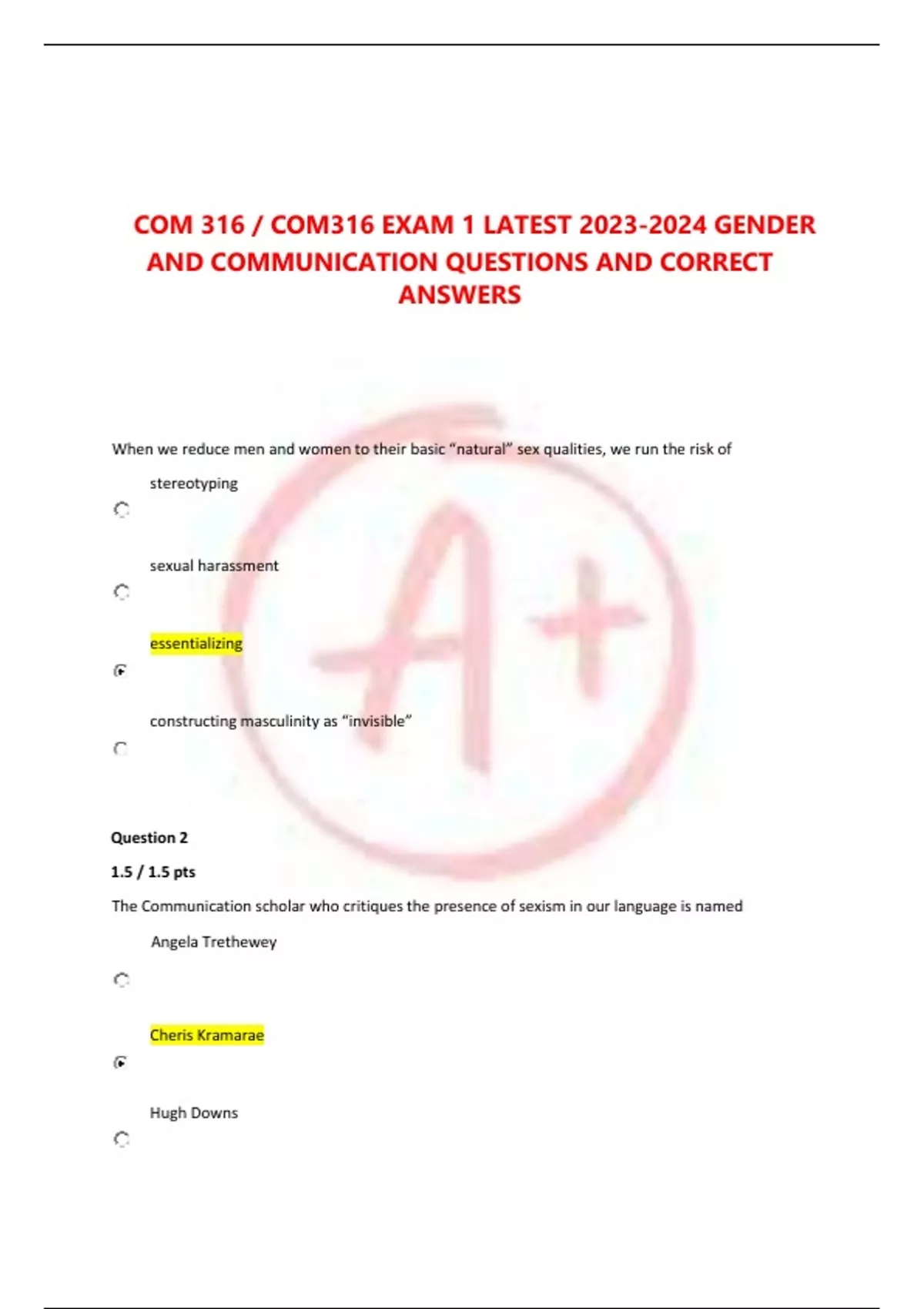 COM 316 / COM316 EXAM 1 LATEST GENDER AND COMMUNICATION QUESTIONS AND CORRECT ANSWERS When we reduce men and women to their basic “natural” sex qualities, we run the risk of stereotyping sexual harassment essentializing constructing masculinity as “invisible” Question 2 1.5 / 1.5 pts The Communication scholar who critiques the presence of sexism in our language is named Angela Trethewey Cheris Kramarae Hugh Downs Marsha Houston Question 3 biological sex 0 / 1.5 pts sexuality When Randall states, "I am a man," he is most specifically referencing his gender identity gender identity Haas suggestsgender presentation that intersex children may have a claim for medical malpractice based on violation of a United States law that prohibits male circumcision psychological trauma genital mutilation sex reassignment Question 5 1.5 / 1.5 pts According to Haas, medical “treatment” of intersexuals has been practiced in the United States since