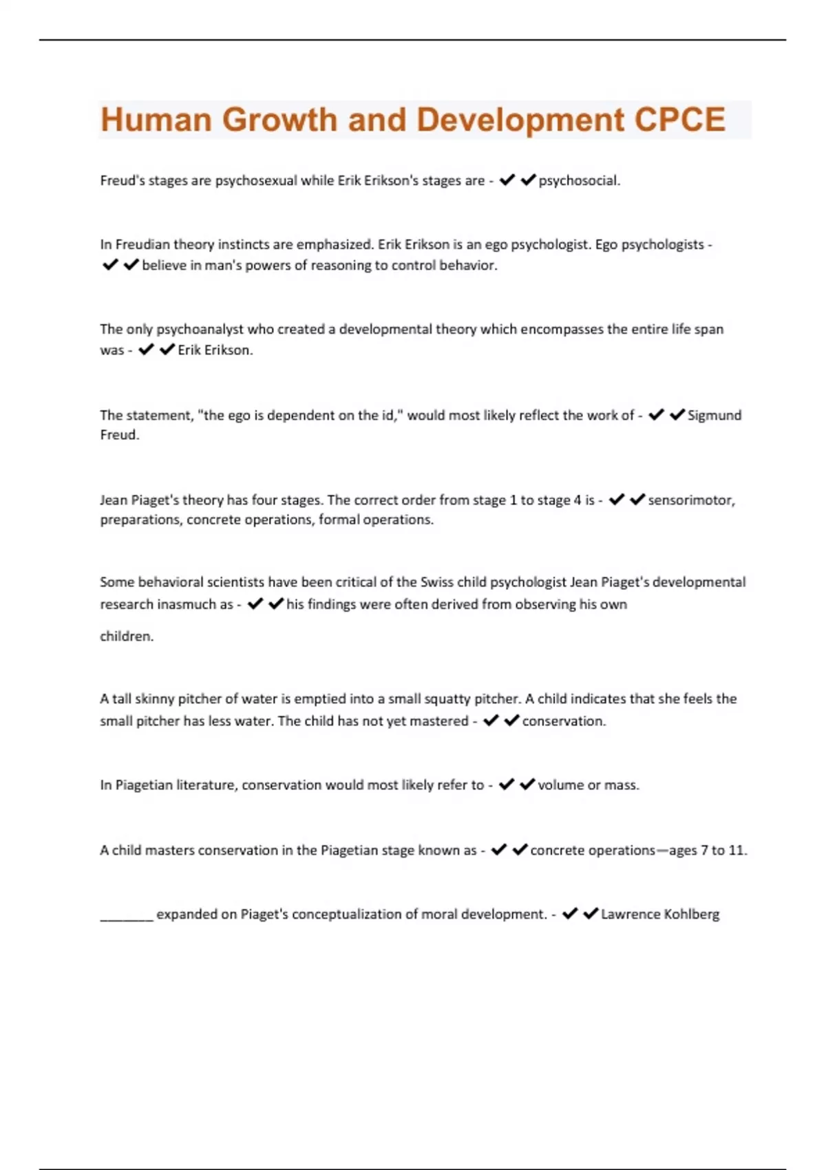 Freud's stages are psychosexual while Erik Erikson's stages are - psychosocial. In Freudian theory instincts are emphasized. Erik Erikson is an ego psychologist. Ego psychologists - believe in man's powers of reasoning to control behavior. The only psychoanalyst who created a developmental theory which encompasses the entire life span was - Erik Erikson. The statement, "the ego is dependent on the id," would most likely reflect the work of - Sigmund Freud. Jean Piaget's theory has four stages. The correct order from stage 1 to stage 4 is - sensorimotor, preparations, concrete operations, formal operations. Some behavioral scientists have been critical of the Swiss child psychologist Jean Piaget's developmental research inasmuch as - his findings were often derived from observing his own children. A tall skinny pitcher of water is emptied into a small squatty pitcher. A child indicates that she feels the small pitcher has less water. The child has not yet mastered - conservation. In Piagetian literature, conservation would most likely refer to - volume or mass. A child masters conservation in the Piagetian stage known as - concrete operations—ages 7 to 11. _______ expanded on Piaget's conceptualization of moral development. - Lawrence KohlbergAccording to Piaget, a child masters the concept of reversibility in the third stage, known as concrete operations or concrete op- erational thought. This notion suggests - one can undo an action, hence an object can return to its initial shape. During a thunderstorm, a 6-year-old child in Piaget's stage of preoperational thought (stage 2) says, "The rain is following me." This is an example of - egocentrism.