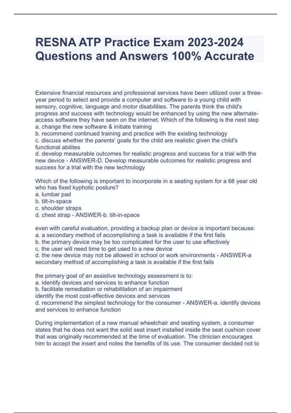 RESNA ATP Practice Exam Questions and Answers 100% Accurate RESNA ATP Practice Exam Questions and Answers 100% Accurate RESNA ATP Practice Exam Questions and Answers 100% Accurate RESNA ATP Practice Exam Questions and Answers 100% Accurate Extensive financial resources and professional services have been utilized over a three-year period to select and provide a computer and software to a young child with sensory, cognitive, language and motor disabilities. The parents think the child's progress and success with technology would be enhanced by using the new alternate-access software they have seen on the internet. Which of the following is the next step a. change the new software & initiate training b. recommend continued training and practice with the existing technology c. discuss whether the parents' goals for the child are realistic given the child's functional abilites d. develop measurable outcomes for realistic progress and success for a trial with the new device - ANSWER-D. Develop measurable outcomes for realistic progress and success for a trial with the new technology Which of the following is important to incorporate in a seating system for a 68 year old who has fixed kyphotic posture? a. lumbar pad b. tilt-in-space c. shoulder straps d. chest strap - ANSWER-b. tilt-in-space even with careful evaluation, providing a backup plan or device is important because: a. a secondary method of accomplishing a task is available if the first fails b. the primary device may be too complicated for the user to use effectively c. the user will need time to get used to a new device d. the new device may not be allowed in school or work environments - ANSWER-a secondary method of accomplishing a task is available if the first fails the primary goal of an assistive technology assessment is to: a. identify devices and services to enhance function