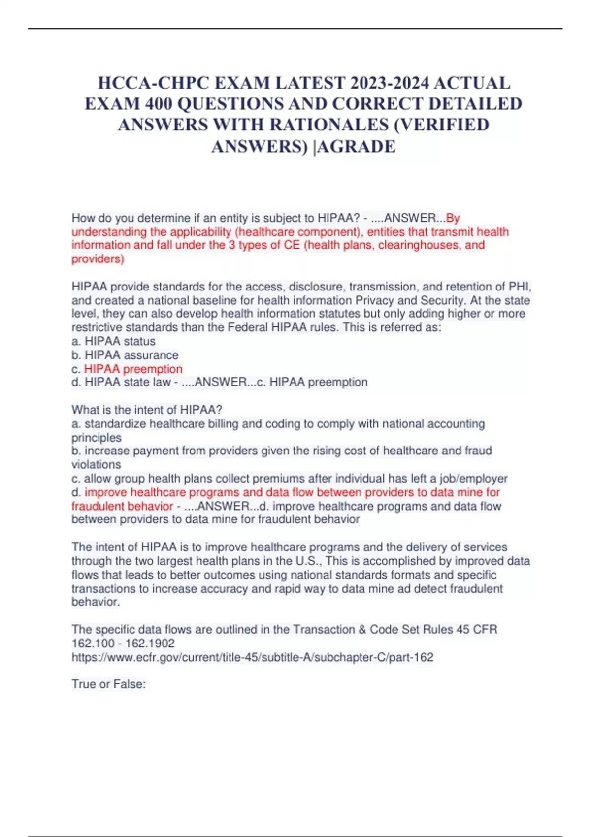 HCCA-CHPC EXAM LATEST ACTUAL EXAM 400 QUESTIONS AND CORRECT DETAILED ANSWERS WITH RATIONALES (VERIFIED ANSWERS) |AGRADE