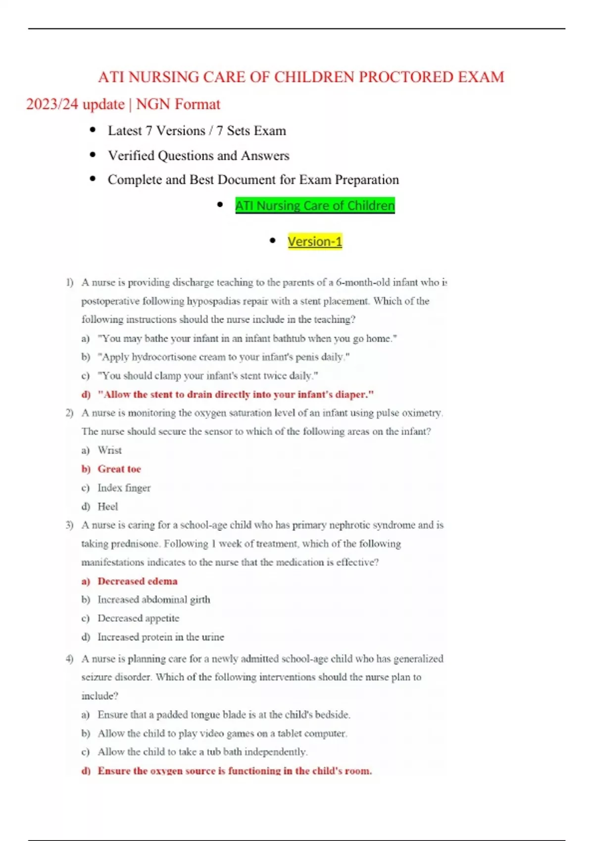 ATI NURSING CARE OF CHILDREN PROCTORED EXAM 2023/24 update | NGN Format ATI NURSING CARE OF CHILDREN PROCTORED EXAM 2023/24 update | NGN Format • Latest 7 Versions / 7 Sets Exam • Verified Questions and Answers • Complete and Best Document for Exam Preparation • ATI Nursing Care of Children • Version-1 • A nurse is receiving change-of-shift report for four children. Which of the following children should the nurse assess first? a. A toddler who has a concussion and an episode of forceful vomiting b. An adolescent who has infective endocarditis and reports having a headache c. An adolescent who was placed into halo traction 1 hr ago and reports pain as 6 on a scale of 0 to 10 d. A school-age child who has acute glomerulonephritis and brown-colored urine • A nurse is caring for a school-age child who has diabetes mellitus and was admitted with a diagnosis of diabetic ketoacidosis. When performing the respiratory assessment, which of the following findings should the nurse expect? a. Deep respirations of 32/min b. Shallow respirations of 10/min c. Paradoxic respirations of 26/min d. Periods of apnea lasting for 20 seconds • A nurse is planning n educational program to teach parents about protecting their children from sunburns. Which of the following instructions should the nurse plan to include? a. "Allow your child to play outside during the hours between 10:00 a.m. and 2:00 p.m." b. "Choose a waterproof sunscreen with a minimum SPF of 15." c. "Dress your child in loose weave polyester fabric prior to sun exposure." d. "Reapply sunscreen every 4 hours." • A nurse is providing teaching to the parents of a preschooler who has heart failure and a new prescription for digoxin twice daily. Which of the following instructions should the nurse include in the teaching? a. "Use a kitchen teaspoon to measure the medication." b. "Brush the child's teeth after giving the medication." c. "Double the next dose if the child misses a dose." d. "Repeat the dose if the child vomits." • A nurse is providing teaching to the family of a school-age child who has juvenile idiopathic arthritis. Which if the following instructions should the nurse include in the teaching? a. "Limit movement of the child's large joints." b. "Encourage the child to perform independent self-care." c. "Provide the child with a soft mattress for sleeping." d. "Schedule a 2-hour daily nap for the child in the afternoon." • A nurse is creating a plan of care for a child who has varicella. Which of the following interventions should the nurse include? a. Maintain the child's room temperature at 80° F. b. Prepare the child for a lumbar puncture. c. Administer aspirin to the child for a temperature greater than 38.3° C (101° F). d. Initiate airborne precautions for the child. • A nurse is providing dietary teaching to the guardian of a school-age child who has cystic fibrosis. Which of the following statements should the nurse make? a. "You should offer your child high-protein meals and snacks throughout the day." b. "You should decrease your child's dietary fat intake to less than 10% of their caloric intake." c. "You should restrict your child's calorie intake to 1,200 per day." d. "You should give your child a multivitamin once weekly." • A nurse is providing discharge teaching to the guardians of a toddler who had lower leg cast applied 24 hr ago. The nurse should instruct the guardians to report which of the following finding to the provider? a. Capillary refill time less than 2 seconds b. Restricted ability to move the toes c. Swelling of the casted foot when the leg is dependent d. Pedal pulse +3 bilateral • A nurse in an emergency department is auscultating the lungs of an adolescent who is experiencing dyspnea. The nurse should identify the sound as which of the following? a. Wheezes b. Crackles c. Pleural friction rub d. Rhonchi • A nurse is caring for a preschooler who has congestive heart failure. The nurse observes wide QRS complexes and peaked T waves on the cardiac monitor. Which of the following prescriptions should the nurse clarify with the provider? a. Furosemide b. Captopril c. Regular insulin d. Potassium chloride • A nurse is planning an educational program for school-age children and their parents about bicycle safety. Which of the following information should the nurse plan to include? a. The child should be able to stand on the balls of their feet when sitting on the bike. b. The child should ride their bike 2 feet to the side of other bike riders. c. The child should wear dark-colored clothing with a fluorescent stripe when riding at night. d. The child should ride the bike facing traffic when it is necessary to ride in the street. • A nurse is an emergency department is caring for a school-age child who has epiglottitis. Which of the following actions should the nurse take? a. Obtain a throat culture from the child. b. Monitor the child's oxygen saturation. c. Put a warm mist humidifier in the child's room. d. Place the child in the supine position • A nurse in an emergency department is caring for a school-age child who has sustained a minor superficial burn from fireworks on their forearm. Which of the following actions should the nurse take? a. Administer the tetanus toxoid vaccine if more than 1 year since the prior dose. b. Apply an antimicrobial ointment to the affected area. c. Leave the burn area open to air. d. Place an ice pack on the affected area. • A nurse in a providers office is caring for a school-age child who has varicella. The parents asks the nurse when their child will no longer be contagious. Which of the following responses should the nurse make? a. "When your child no longer has an increased temperature." b. "Three days after you first noticed the rash appear on your child." c. "When your child's lesions are crusted, usually 6 days after they appear." d. "Two to three weeks, when your child's lesions completely disappear." • A nurse is providing d