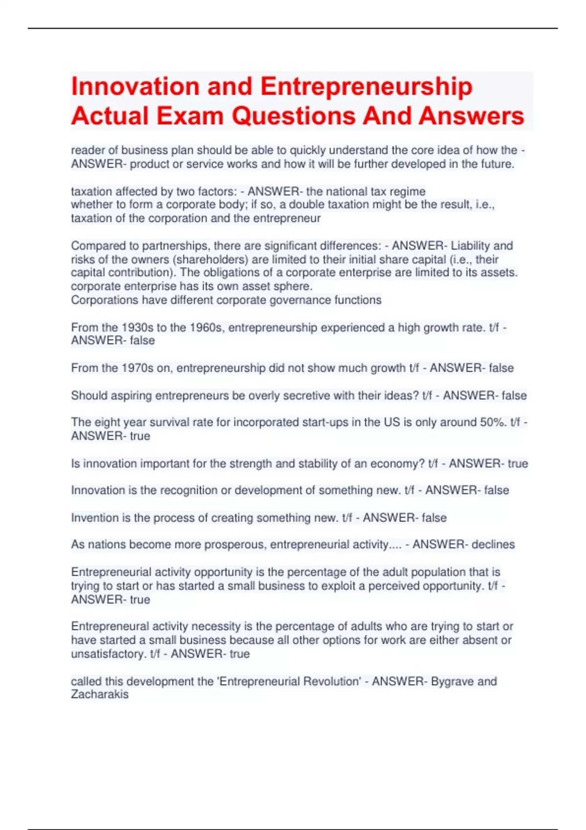 Innovation and Entrepreneurship Actual Exam Questions And Answers reader of business plan should be able to quickly understand the core idea of how the - ANSWER- product or service works and how it will be further developed in the future. taxation affected by two factors: - ANSWER- the national tax regime whether to form a corporate body; if so, a double taxation might be the result, i.e., taxation of the corporation and the entrepreneur Compared to partnerships, there are significant differences: - ANSWER- Liability and risks of the owners (shareholders) are limited to their initial share capital (i.e., their capital contribution). The obligations of a corporate enterprise are limited to its assets. corporate enterprise has its own asset sphere. Corporations have different corporate governance functions From the 1930s to the 1960s, entrepreneurship experienced a high growth rate. t/f - ANSWER- false From the 1970s on, entrepreneurship did not show much growth t/f - ANSWER- false Should aspiring entrepreneurs be overly secretive with their ideas? t/f - ANSWER- false The eight year survival rate for incorporated start-ups in the US is only around 50%. t/f - ANSWER- true Is innovation important for the strength and stability of an economy? t/f - ANSWER- true Innovation is the recognition or development of something new. t/f - ANSWER- false Invention is the process of creating something new. t/f - ANSWER- false As nations become more prosperous, entrepreneurial activity.... - ANSWER- declines Entrepreneurial activity opportunity is the percentage of the adult population that is trying to start or has started a small business to exploit a perceived opportunity. t/f - ANSWER- true Entrepreneural activity necessity is the percentage of adults who are trying to start or have started a small business because all other options for work are either absent or unsatisfactory. t/f - ANSWER- true called this development the 'Entrepreneurial Revolution' - ANSWER- Bygrave and Zacharakis underlying causes of Entrepreneurial Revolution - ANSWER- Cultural and social norms: Many individuals started their own businesses. Government: governments reduced capital gains tax, triggering investment activity. R&D transfer: In the US, publicly-sponsored research now patented by organizations. Physical infrastructure: Doing business online requires less physical infrastructure than in traditional 'brick and mortar' businesses. Human infrastructure: entrepreneurial experts help people who are starting or expanding companies. In some countries such as Germany, publicly sponsored programs like Existenzgründer-Program sponsored by the Federal Government exist in order to assist would-be entrepreneurs. Education, training, and professionalism: more colleges and universities integrate courses on innovation and entrepreneurship into their curriculum. Boone and Kurtz draw attention to the rapid globalization of business in the last decades also creating _________________________________ who can market their products abroad and hire _____________________ - ANSWER- opportunities for entrepreneurs talent internationally. Boone and Kurtz argue that entrepreneurs are actually different from - ANSWER- 'small business owners' How are entrepreneurs different from small business owners? - ANSWER- entrepreneurs seek expansion as a major goal. 'lifestyle' entrepreneurs— people who start a business to gain greater flexibility in their working hours and who want more control of their lives. What all these individuals have in common is that their business model is limited by the working hours they manage to invest small businesses are the most important entrepreneurial ventures'entrepreneurial revolution' has been driven mostly by small businesses. 'lifestyle' entrepreneurs— - ANSWER- people who start a business to gain greater flexibility in their working hours and who want more control of their lives Personal traits emphasized of an entrepreneur - ANSWER- uniqueness of personality, their innovative nature, ability to create something new Jean-Baptiste Say, an economist, says the economy was based on three factors: - ANSWER- human labor, capital, and real estate Coordination of production factors is a - ANSWER- core function in business administration. entrepreneur is the most important production factor, as it combines - ANSWER- knowledge with labor workforce. The major function of an entrepreneur is the - ANSWER- coordination of production factors . profit which the entrepreneur makes is - ANSWER- his reward for that coordination the 'interest' he earns from his employed capital premium earned for taking risks In order to be successful, the entrepreneur must possess several unique features: - ANSWER- good judgment, perseverance, knowledge of the world, and an understanding of commerce administrative/supervisory skills ability to overcome obstacles and misfortunes, and not to be dictated by anxiety or fear Frank Hyneman Knight, an economist, drew attention to the importance of - ANSWER- uncertainty important economists - ANSWER- Jean-Baptiste Say Frank Hyneman Knight Schumpeter entrepreneur specializes in __________________________ and copes skillfully with __________________. - ANSWER- decision-making uncertainty the quality of decision-making which leads to superior ____________ - ANSWER- profits in a free society it is not possible to separate the following three factors from one another: - ANSWER- uncertainty, freedom of decision-making, and responsibility/control go hand-in-hand Wages and payment are differential depending on - ANSWER- freedoms, responsibilities, and risk According to Schumpeter, an entrepreneur is a person who - ANSWER- destroys the existing economic order by introducing new products and services and new methods of production by creating new forms of organization by exploiting new raw materials. Pioneer-entreprenuers - ANSWER- Entrepreneurs offering innovation. Innovation - ANSWER- Realizing and successfully m