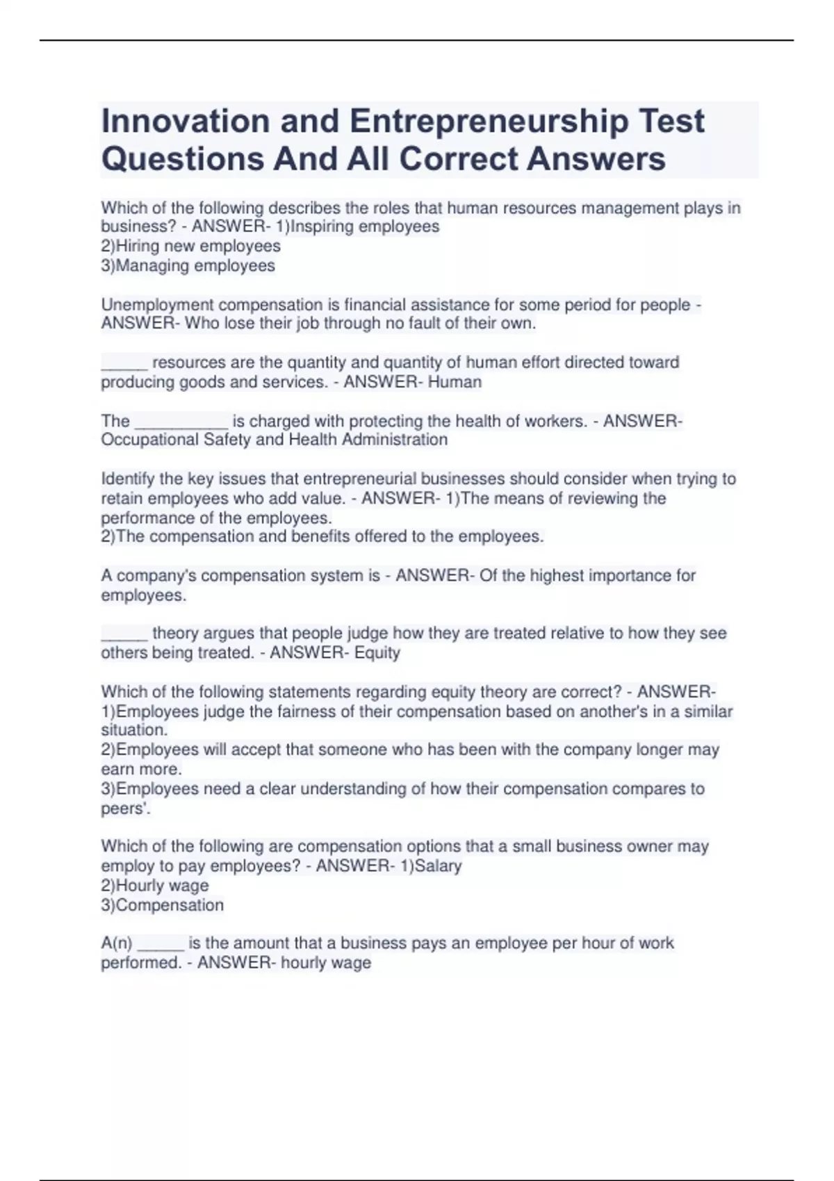Innovation and Entrepreneurship Test Questions And All Correct Answers Which of the following describes the roles that human resources management plays in business? - ANSWER- 1)Inspiring employees 2)Hiring new employees 3)Managing employees Unemployment compensation is financial assistance for some period for people - ANSWER- Who lose their job through no fault of their own. _____ resources are the quantity and quantity of human effort directed toward producing goods and services. - ANSWER- Human The __________ is charged with protecting the health of workers. - ANSWER- Occupational Safety and Health Administration Identify the key issues that entrepreneurial businesses should consider when trying to retain employees who add value. - ANSWER- 1)The means of reviewing the performance of the employees. 2)The compensation and benefits offered to the employees. A company's compensation system is - ANSWER- Of the highest importance for employees. _____ theory argues that people judge how they are treated relative to how they see others being treated. - ANSWER- Equity Which of the following statements regarding equity theory are correct? - ANSWER- 1)Employees judge the fairness of their compensation based on another's in a similar situation. 2)Employees will accept that someone who has been with the company longer may earn more. 3)Employees need a clear understanding of how their compensation compares to peers'. Which of the following are compensation options that a small business owner may employ to pay employees? - ANSWER- 1)Salary 2)Hourly wage 3)Compensation A(n) _____ is the amount that a business pays an employee per hour of work performed. - ANSWER- hourly wage A _____ is a set amount of compensation for a given time period. - ANSWER- salary A _____ is payment based on a percentage of sales. - ANSWER- commission Commission compensation systems can be abused and - ANSWER- May be a source of frustration for both employees and the employer. Which of the following statements regarding changing the commission system as the company grows are correct? - ANSWER- 1)Existing salespeople do not like changes to compensation systems that decrease commissions. 2)Business owners need to think about the sales commission long term when creating it. 3)New hires do not think it is fair to be paid a lower commission than older sales staff. A hybrid compensation system - ANSWER- Pays a salary along with a commission. Business owners who offer profit sharing - ANSWER- Pay employees a small salary but offer a percentage of the profits that the company earns. __________ rewards employees based on their performance. - ANSWER- A bonus The __________ established a minimum wage for workers. - ANSWER- Fair Labor Standards Act (FLSA) Which of the following statements regarding the minimum-wage requirements of the Fair Labor Standard Act (FLSA) are correct? - ANSWER- 1)The Act does not work on small farms. 2)States may set a minimum wage higher than set by the FLSA. 3)The Act covers virtually all workers. Some major cities pay what has been called a _____ wage that is indexed to what someone who works 40 hours per week needs to stay above the poverty line. - ANSWER- Living The Equal Pay Act requires employers - ANSWER- Not to discriminate in pay to men and women who do the same job. Which of the following statements about the FLSA requirements regarding nonexempt employees are correct? - ANSWER- 1)Firms that pay employees on a weekly basis cannot use compensatory time. 2)Compensatory time is not typically allowed from one pay period to the next. 3)Nonexempt employees who work over 40 hours per week must be paid time and a half. The government - ANSWER- Closely regulates children who work under the age of 16.