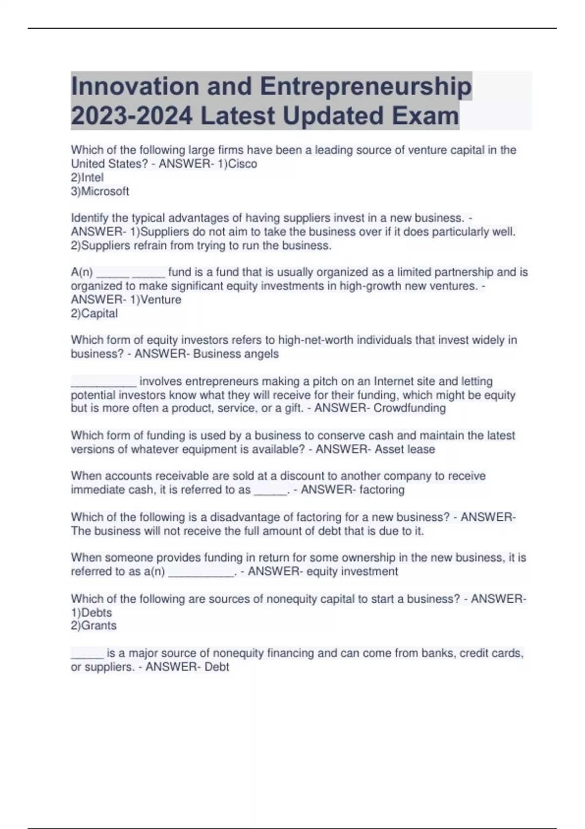 Innovation and Entrepreneurship Latest Updated Exam Which of the following large firms have been a leading source of venture capital in the United States? - ANSWER- 1)Cisco 2)Intel 3)Microsoft Identify the typical advantages of having suppliers invest in a new business. - ANSWER- 1)Suppliers do not aim to take the business over if it does particularly well. 2)Suppliers refrain from trying to run the business. A(n) _____ _____ fund is a fund that is usually organized as a limited partnership and is organized to make significant equity investments in high-growth new ventures. - ANSWER- 1)Venture 2)Capital Which form of equity investors refers to high-net-worth individuals that invest widely in business? - ANSWER- Business angels __________ involves entrepreneurs making a pitch on an Internet site and letting potential investors know what they will receive for their funding, which might be equity but is more often a product, service, or a gift. - ANSWER- Crowdfunding Which form of funding is used by a business to conserve cash and maintain the latest versions of whatever equipment is available? - ANSWER- Asset lease When accounts receivable are sold at a discount to another company to receive immediate cash, it is referred to as _____. - ANSWER- factoring Which of the following is a disadvantage of factoring for a new business? - ANSWER- The business will not receive the full amount of debt that is due to it. When someone provides funding in return for some ownership in the new business, it is referred to as a(n) __________. - ANSWER- equity investment Which of the following are sources of nonequity capital to start a business? - ANSWER- 1)Debts 2)Grants _____ is a major source of nonequity financing and can come from banks, credit cards, or suppliers. - ANSWER- Debt A(n) _____ is simply money designed to help the new business begin operations with no expectation of repayment. - ANSWER- grant Which of the following is NOT a common form of debt for a new business? - ANSWER- Venture capital What is the generic term used to describe any type of nonequity funding tied to the business? - ANSWER- Debt Which type of funding involves a contractual agreement whereby the business receives some amount of money that must be repaid over a specified period of time at a specified interest rate? - ANSWER- Loan Banks have traditionally been a major source of funds for: - ANSWER- established firms. TRUE/FALSE: There is no need to treat a loan from family as a contractual agreement. - ANSWER- FALSE