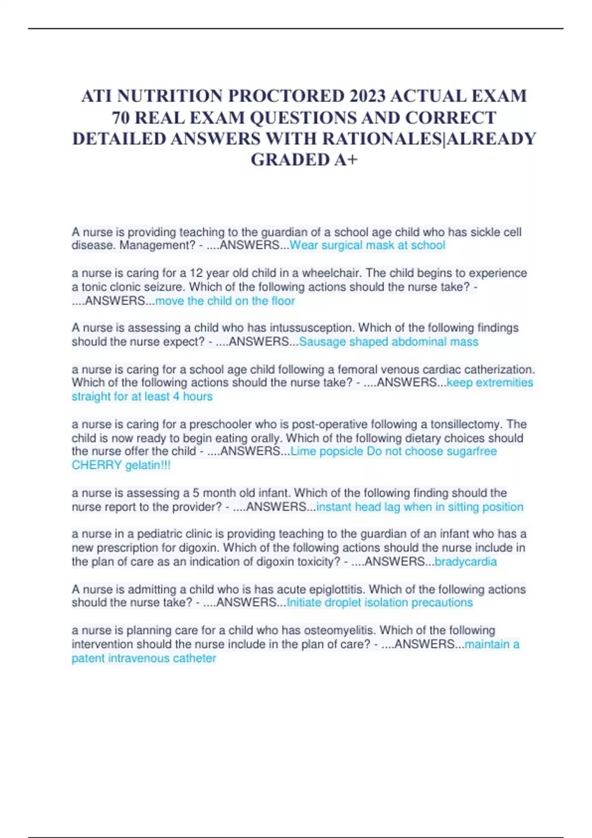 ATI NUTRITION PROCTORED 2023 ACTUAL EXAM 70 REAL EXAM QUESTIONS AND CORRECT DETAILED ANSWERS WITH RATIONALES|ALREADY GRADED A+