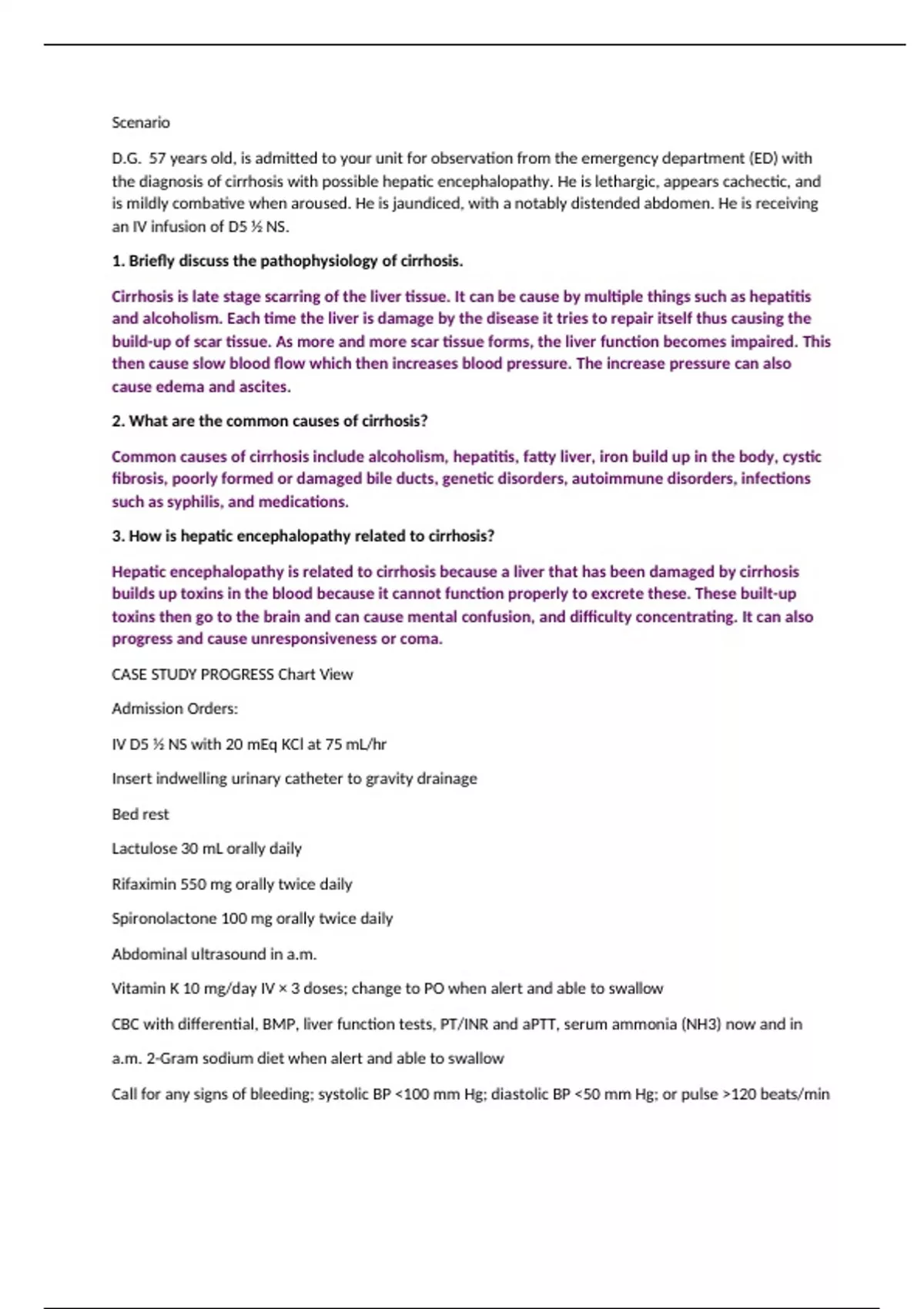 NUR 265 Cirrhosis Case study 2023/24/NUR 265 Cirrhosis Case study 2023/24 Scenario D.G. 57 years old, is admitted to your unit for observation from the emergency department (ED) with the diagnosis of cirrhosis with possible hepatic encephalopathy. He is lethargic, appears cachectic, and is mildly combative when aroused. He is jaundiced, with a notably distended abdomen. He is receiving an IV infusion of D5 ½ NS. 1. Briefly discuss the pathophysiology of cirrhosis. Cirrhosis is late stage scarring of the liver tissue. It can be cause by multiple things such as hepatitis and alcoholism. Each time the liver is damage by the disease it tries to repair itself thus causing the build-up of scar tissue. As more and more scar tissue forms, the liver function becomes impaired. This then cause slow blood flow which then increases blood pressure. The increase pressure can also cause edema and ascites. 2. What are the common causes of cirrhosis? Common causes of cirrhosis include alcoholism, hepatitis, fatty liver, iron build up in the body, cystic fibrosis, poorly formed or damaged bile ducts, genetic disorders, autoimmune disorders, infections such as syphilis, and medications. . . . . . . . .