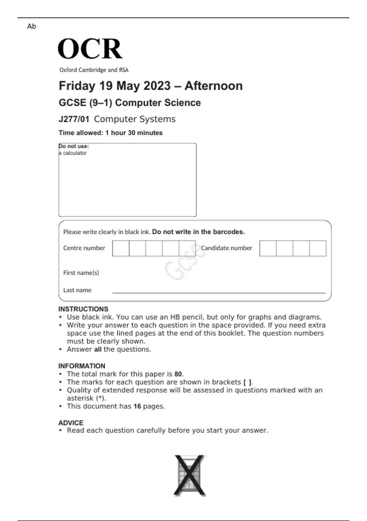 OCR GCSE (9–1) Computer Science J277/01 JUNE 2023 QUESTION PAPER: Computer Systems