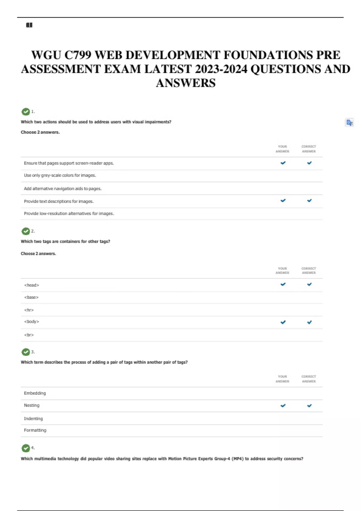 WGU C799 WEB DEVELOPMENT FOUNDATIONS PRE ASSESSMENT EXAM LATEST QUESTIONS AND ANSWERS 1. Which two actions should be used to address users with visual impairments? Choose 2 answers. YOUR ANSWER CORRECT ANSWER Ensure that pages support screen-reader apps. Use only grey-scale colors for images. Add alternative navigation aids to pages. Provide text descriptions for images. Provide low-resolution alternatives for images. 2. Which two tags are containers for other tags? Choose 2 answers. YOUR ANSWER CORRECT ANSWER <head> <base> <hr> <body> <br> 3. Which term describes the process of adding a pair of tags within another pair of tags? YOUR ANSWER CORRECT ANSWER Embedding Nesting Indenting Formatting 4. Which multimedia technology did popular video sharing sites replace with Motion Picture Experts Group-4 (MP4) to address security concerns? YOUR ANSWER CORRECT ANSWER WAV WebM YOUR ANSWER CORRECT ANSWER Ogg Flash 5. Which markup should be used to link a CSS document to a web page? YOUR ANSWER CORRECT ANSWER <link rel= "stylesheet" type="text/css" href=""> <link "stylesheet" type="text/css" href=""> <script rel="stylesheet" type="text/css" url=""> <script "stylesheet" type "text/css" href=“">