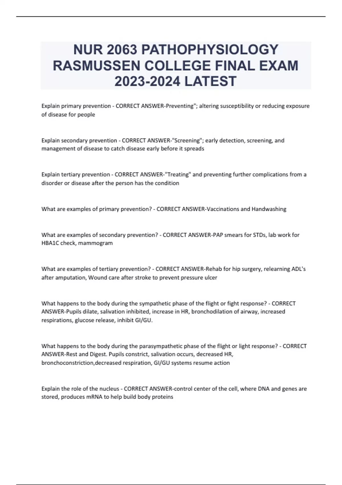NUR 2063 PATHOPHYSIOLOGY RASMUSSEN COLLEGE FINAL EXAM LATEST Explain primary prevention - CORRECT ANSWER-Preventing"; altering susceptibility or reducing exposure of disease for people Explain secondary prevention - CORRECT ANSWER-"Screening"; early detection, screening, and management of disease to catch disease early before it spreads Explain tertiary prevention - CORRECT ANSWER-"Treating" and preventing further complications from a disorder or disease after the person has the condition What are examples of primary prevention? - CORRECT ANSWER-Vaccinations and Handwashing What are examples of secondary prevention? - CORRECT ANSWER-PAP smears for STDs, lab work for HBA1C check, mammogram What are examples of tertiary prevention? - CORRECT ANSWER-Rehab for hip surgery, relearning ADL's after amputation, Wound care after stroke to prevent pressure ulcer What happens to the body during the sympathetic phase of the flight or fight response? - CORRECT ANSWER-Pupils dilate, salivation inhibited, increase in HR, bronchodilation of airway, increased respirations, glucose release, inhibit GI/GU. What happens to the body during the parasympathetic phase of the flight or light response? - CORRECT ANSWER-Rest and Digest. Pupils constrict, salivation occurs, decreased HR, bronchoconstriction,decreased respiration, GI/GU systems resume action Explain the role of the nucleus - CORRECT ANSWER-control center of the cell, where DNA and genes are stored, produces mRNA to help build body proteins Explain the role of the mitochondria - CORRECT ANSWER-Powerhouse of the cell. Provides energy in ATP, and has its own set of DNA Explain the role of the ribosome - CORRECT ANSWER-produces RNA to produce proteins through transcriptions of DNA and translation of RNA into a protein Explain the role of the lysosomes - CORRECT ANSWER-helps breakdown and digest dead cells, organelles, or tissues Explain the role of the rough ER - CORRECT ANSWER-folded membranes that move proteins around the cell. Has ribosomes attached to it and helps produce proteins for the cell membrane Explain the role of the smooth ER - CORRECT ANSWER-helps the Liver and kidney cells to detoxify, lipid metabolism, synthesis of hormones, and calcium storage Explain the role of the peroxisome - CORRECT ANSWER-membrane cells that contain oxidase and catalase to detoxify harmful chemicals, breakdown hydrogen peroxide and filter metabolic wastes Explain the role of the Golgi body - CORRECT ANSWER-stacked membranes that act as the sorter and packager for proteins from the ER. Helps move things in and out of cell Explain passive immunity - CORRECT ANSWER-the transfer of preformed antibodies against specific antigens from a protected or immunized individual to an unprotected or non immunized person. Provides immediate and short term protection. No memory cells are produced. IgA and IgE. Passes protection What are examples of passive immunity? - CORRECT ANSWER-mom to fetus through placenta or mom to infant through breast milk. Serotherapy Explain active immunity - CORRECT ANSWER-a protective state owing to the immune system response as a result of active infection or immunization. It has to be activated in the body and the body has to fight it to have long term immunity What are examples of active immunity? - CORRECT ANSWER-Vaccinations Explain what edema is - CORRECT ANSWER-accumulation of fluid in the interstitial space. Leads to tissue swelling What are some causes of edema? - CORRECT ANSWER-increase in the forces that move fluid from capillaries to interstitial compartments or decrease in the opposite. What are factors that contribute to edema? - CORRECT ANSWER-Increase in hydrostatic forces in the capillaries that increases the blood volume, increased capillary permeability, CHF, HYPTN, decrease in plasma proteins like albumin (causes liver to hold onto more water- ascites, cirrhosis), blockage of lymph drainage What is a hypersensitivity? - CORRECT ANSWER-an overreaction to antigens or allergens that is beyond the normal range, leading to damage What is a type 1 hypersensitivity? - CORRECT ANSWER-anaphylactic. Occurs within 2-30mins of exposure. Can be systemic or localized. Binds to IgE and mast cells that release histamine, leukotrienes, and prostaglandins to create inflammation Mediating Factor for type 1 hypersensitivity - CORRECT ANSWER-IgE Examples of type 1 hypersensitivity - CORRECT ANSWER-allergic reaction to dust. someone eats peanuts and breaks out in hives and runny nose How do we treat type 1 hypersensitivity reactions? - CORRECT ANSWER-antihistamines to block histamine, beta adrenergics to bronchodilator , corticosteroids, to decrease inflammation. IgE therapy, epinephrine given during anaphylaxis through IV or through IM in epipens What are signs and symptoms of a type 1 hypersensitivity reaction? - CORRECT ANSWER-hives, runny nose, eczema, throat constriction, ,localized edema, wheezing, tachycardia, anaphylaxis. Explain Type 2 Hypersensitivity - CORRECT ANSWER-The cells attack healthy organs and blood, causing symptoms Mediating factor for type 2 hypersensitivity - CORRECT ANSWER-cytotoxic- IgM/ IgG Examples of type 2 hypersensitivity - CORRECT ANSWER-Blood transfusions when wrong blood given, hemolytic disease of newborn, grans disease, myasthenia gravis What is type 3 hypersensitivity? - CORRECT ANSWER-The igG antibodies are stuck beneath the membranes of cells. Can activate immune responses that can damage tissues. Immune complex Mediating factor type 3 hypersensitivity - CORRECT ANSWER-immune complexes Examples type 3 hypersensitivity - CORRECT ANSWER-RA, lupus What is type 4 hypersensitivity? - CORRECT ANSWER-there is a delayed cell reaction caused by the T cells. Antigens are phagocytized and are sensitized to receptors on the t cell. Reexposure causes the memory cells to release destructive cytokines. Mediating factor type 4 hypersensitivity - CORRECT ANSWER-delayed cell mediated Examples type 4 hypersensitivity - CORRECT ANSWE