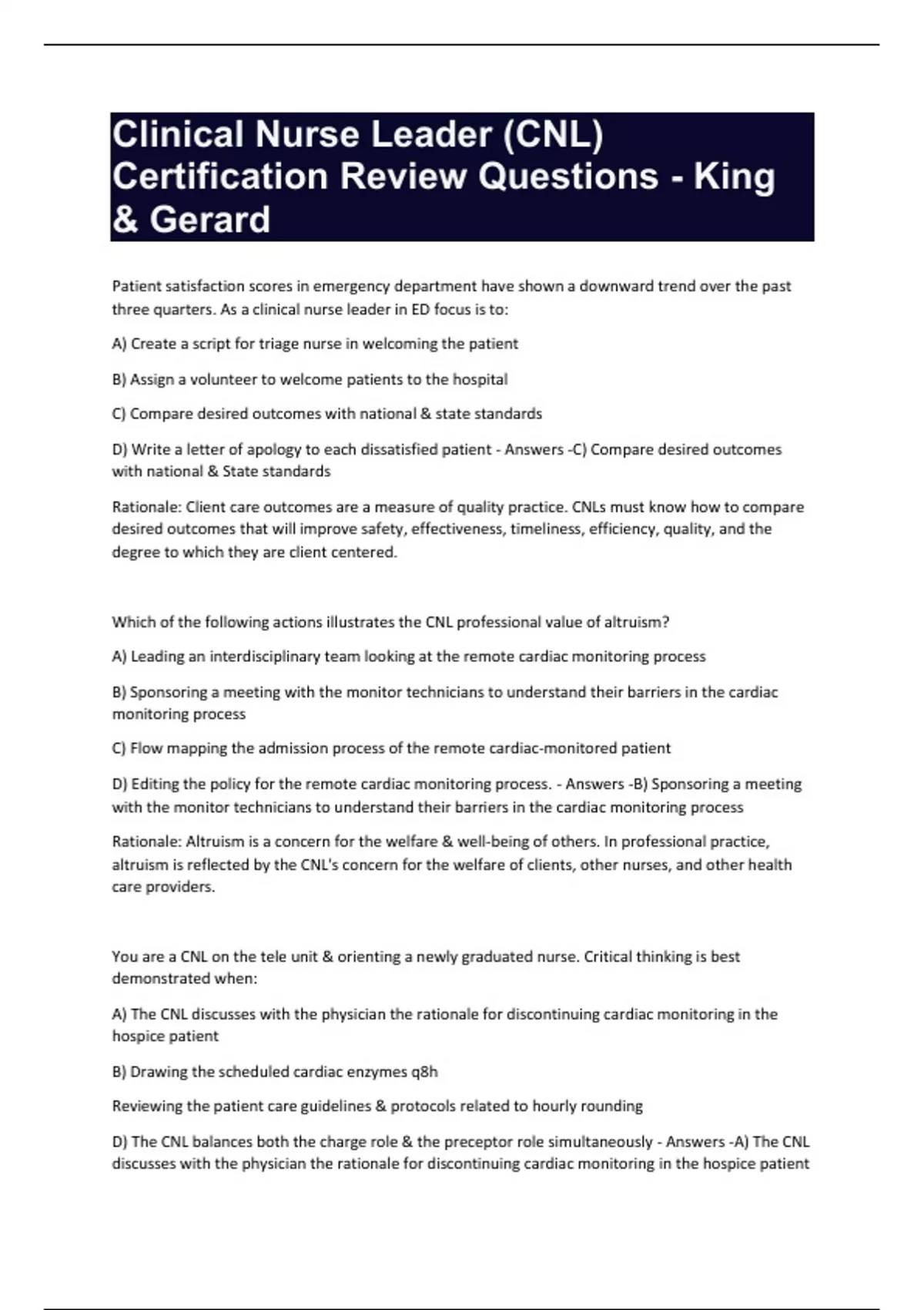 Clinical Nurse Leader (CNL) Certification Review Questions and Answers- King & Gerard