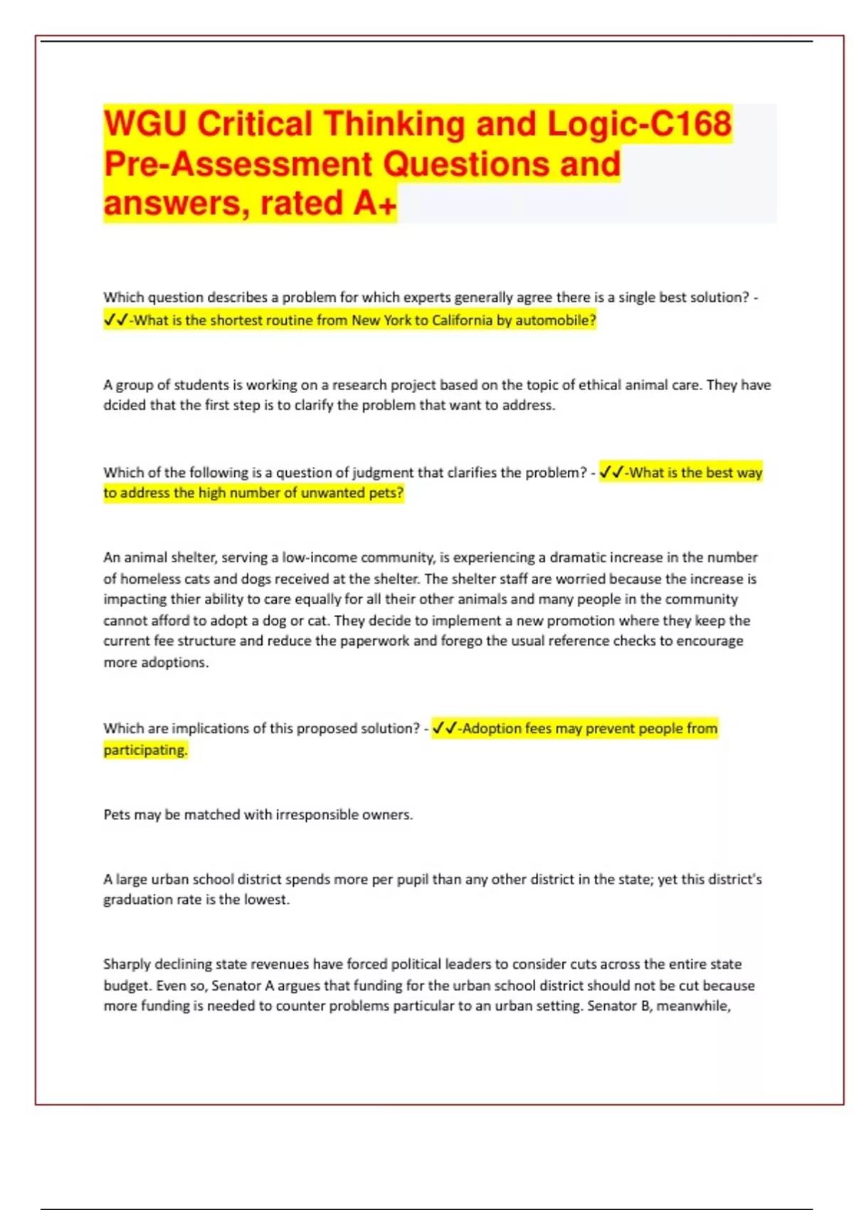 WGU Critical Thinking and Logic-C168 Pre-Assessment Questions and answers, rated A+