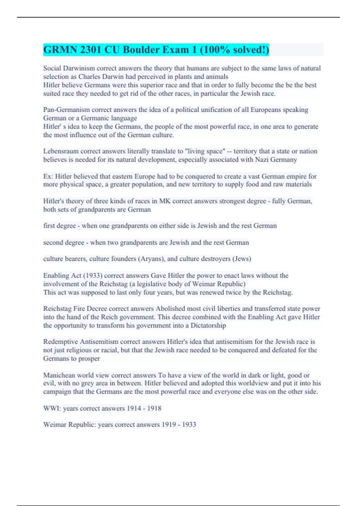 Social Darwinism correct answers the theory that humans are subject to the same laws of natural selection as Charles Darwin had perceived in plants and animals Hitler believe Germans were this superior race and that in order to fully become the be the best suited race they needed to get rid of the other races, in particular the Jewish race. Pan-Germanism correct answers the idea of a political unification of all Europeans speaking German or a Germanic language Hitler' s idea to keep the Germans, the people of the most powerful race, in one area to generate the most influence out of the German culture. Lebensraum correct answers literally translate to "living space" -- territory that a state or nation believes is needed for its natural development, especially associated with Nazi Germany Ex: Hitler believed that eastern Europe had to be conquered to create a vast German empire for more physical space, a greater population, and new territory to supply food and raw materials Hitler's theory of three kinds of races in MK correct answers strongest degree - fully German, both sets of grandparents are German first degree - when one grandparents on either side is Jewish and the rest German second degree - when two grandparents are Jewish and the rest German culture bearers, culture founders (Aryans), and culture destroyers (Jews) Enabling Act (1933) correct answers Gave Hitler the power to enact laws without the involvement of the Reichstag (a legislative body of Weimar Republic) This act was supposed to last only four years, but was renewed twice by the Reichstag. Reichstag Fire Decree correct answers Abolished most civil liberties and transferred state power into the hand of the Reich government. This decree combined with the Enabling Act gave Hitler the opportunity to transform his government into a Dictatorship Redemptive Antisemitism correct answers Hitler's idea that antisemitism for the Jewish race is not just religious or racial, but that the Jewish race needed to be conquered and defeated for the Germans to prosper Manichean world view correct answers To have a view of the world in dark or light, good or evil, with no grey area in between. Hitler believed and adopted this worldview and put it into his campaign that the Germans are the most powerful race and everyone else was on the other side. WWI: years correct answers Weimar Republic: years correct answers