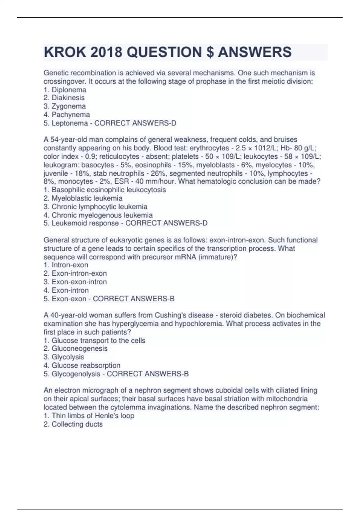 KROK 2018 QUESTION $ ANSWERS Genetic recombination is achieved via several mechanisms. One such mechanism is crossingover. It occurs at the following stage of prophase in the first meiotic division: 1. Diplonema 2. Diakinesis 3. Zygonema 4. Pachynema 5. Leptonema - CORRECT ANSWERS-D A 54-year-old man complains of general weakness, frequent colds, and bruises constantly appearing on his body. Blood test: erythrocytes - 2.5 × 1012/L; Hb- 80 g/L; color index - 0.9; reticulocytes - absent; platelets - 50 × 109/L; leukocytes - 58 × 109/L; leukogram: basocytes - 5%, eosinophils - 15%, myeloblasts - 6%, myelocytes - 10%, juvenile - 18%, stab neutrophils - 26%, segmented neutrophils - 10%, lymphocytes - 8%, monocytes - 2%, ESR - 40 mm/hour. What hematologic conclusion can be made? 1. Basophilic eosinophilic leukocytosis 2. Myeloblastic leukemia 3. Chronic lymphocytic leukemia 4. Chronic myelogenous leukemia 5. Leukemoid response - CORRECT ANSWERS-D General structure of eukaryotic genes is as follows: exon-intron-exon. Such functional structure of a gene leads to certain specifics of the transcription process. What sequence will correspond with precursor mRNA (immature)? 1. Intron-exon 2. Exon-intron-exon 3. Exon-exon-intron 4. Exon-intron 5. Exon-exon - CORRECT ANSWERS-B A 40-year-old woman suffers from Cushing's disease - steroid diabetes. On biochemical examination she has hyperglycemia and hypochloremia. What process activates in the first place in such patients? 1. Glucose transport to the cells 2. Gluconeogenesis 3. Glycolysis 4. Glucose reabsorption 5. Glycogenolysis - CORRECT ANSWERS-B An electron micrograph of a nephron segment shows cuboidal cells with ciliated lining on their apical surfaces; their basal surfaces have basal striation with mitochondria located between the cytolemma invaginations. Name the described nephron segment: 1. Thin limbs of Henle's loop 2. Collecting ducts 3. Proximal tubule 4. Distal tubule 5. Glomerular capsule - CORRECT ANSWERS-C A woman has come to the hospital with complaints of general weakness, dizziness, and dyspnea. Recently she has been taking levomycetin (chloramphenicol) for prevention of enteric infection. Blood test: erythrocytes - 1.9 × 10 12/L, hemoglobin - 58 g/L, color index - 0.9, leukocytes - 2.2 G/L, reticulocytes - 0.3%. What type of anemia is it indicative of? 1. Hemolytic 2. Aplastic 3. Iron-deficiency 4. Hypoplastic 5. Metaplastic - CORRECT ANSWERS-D A patient presents with dilated blood vessels of the anterior medial surface of the lower leg. This condition resulted from the dilation of the following blood vessel: 1. V. saphena magna 2. А. tibialis posterior 3. А. tibialis anterior 4. V. saphena parva 5. V. poplitea - CORRECT ANSWERS-A Genealogical analysis of a child with myotonic dystrophy determined that this disease is present in every generation, equally presented by the relatives of both genders, the risk of inheriting this disease is equal no matter which parent is affected. If one of the parents is heterozygous for this disease and the other parent is healthy, the risk of them giving birth to a sick child is 50%. What type of disease inheritance is it? 1. X-linked recessive 2. Autosomal recessive 3. Autosomal dominant 4. X-linked dominant 5. Y-linked - CORRECT ANSWERS-C A specimen of a 10-day-old human embryo shows two interconnected sacs (amniotic and yolk sacs). Name the structure located in the place where these two sacs connect: 1. Floor of the amniotic sac 2. Roof of the amniotic sac 3. Amniotic stalk 4. Extraembryonic mesoderm 5. Embryonic shield - CORRECT ANSWERS-E After a hand fracture the man has lost the ability to touch his little finger with the thumb on the affected hand. Examination of the palmar surface shows one of the palmar muscles to be atrophied. Name the affected muscle: 1. M. flexor digiti minimi 2. Mm. interossei 3. Mm. lumbricales 4. M. opponens policis 5. M. palmaris brevis - CORRECT ANSWERS-D A 45-year-old man diagnosed with hepatic cirrhosis and ascites underwent drainage of 5 liters of fluid from his abdominal cavity, which resulted in development of syncopal state due to insufficient blood supply to the brain. What circulatory disorder occurred in the abdominal cavity in this case? 1. Venous hyperemia 2. Ischemia 3. Embolism 4. Arterial hyperemia 5. Thrombosis - CORRECT ANSWERS-D A patient suffers from posttraumatic hemorrhage that resulted in development of hemorrhagic shock. What volume of circulating blood was lost by the patient? 1. 50-75% 2. 40-50% 3. 12-25% 4. 25-40% 5. 3-20% - CORRECT ANSWERS-D A 17-year-old girl suffers from periodical palpitations that last several minutes. Her heart rate is 200/min., rhythmic. What heart rhythm disorder developed in this patient? 1. Sinus tachycardia 2. Sinus bradycardia 3. Extrasystole 4. Atrioventricular block 5. Paroxysmal tachycardia - CORRECT ANSWERS-E Vestibular receptors of semicircular canals of a test animal have been destroyed. What reflexes will disappear as a result? 1. Primary orienting reflex 2. Statokinetic reflex during movements with linear acceleration 3. Body-righting reflex 4. Statokinetic reflex during movements with angular acceleration 5. Head-righting reflex - CORRECT ANSWERS-D A hereditary disease - homocystinuria - is caused by disturbed transformati-on of homocysteine into methionine. Accumulated homocysteine