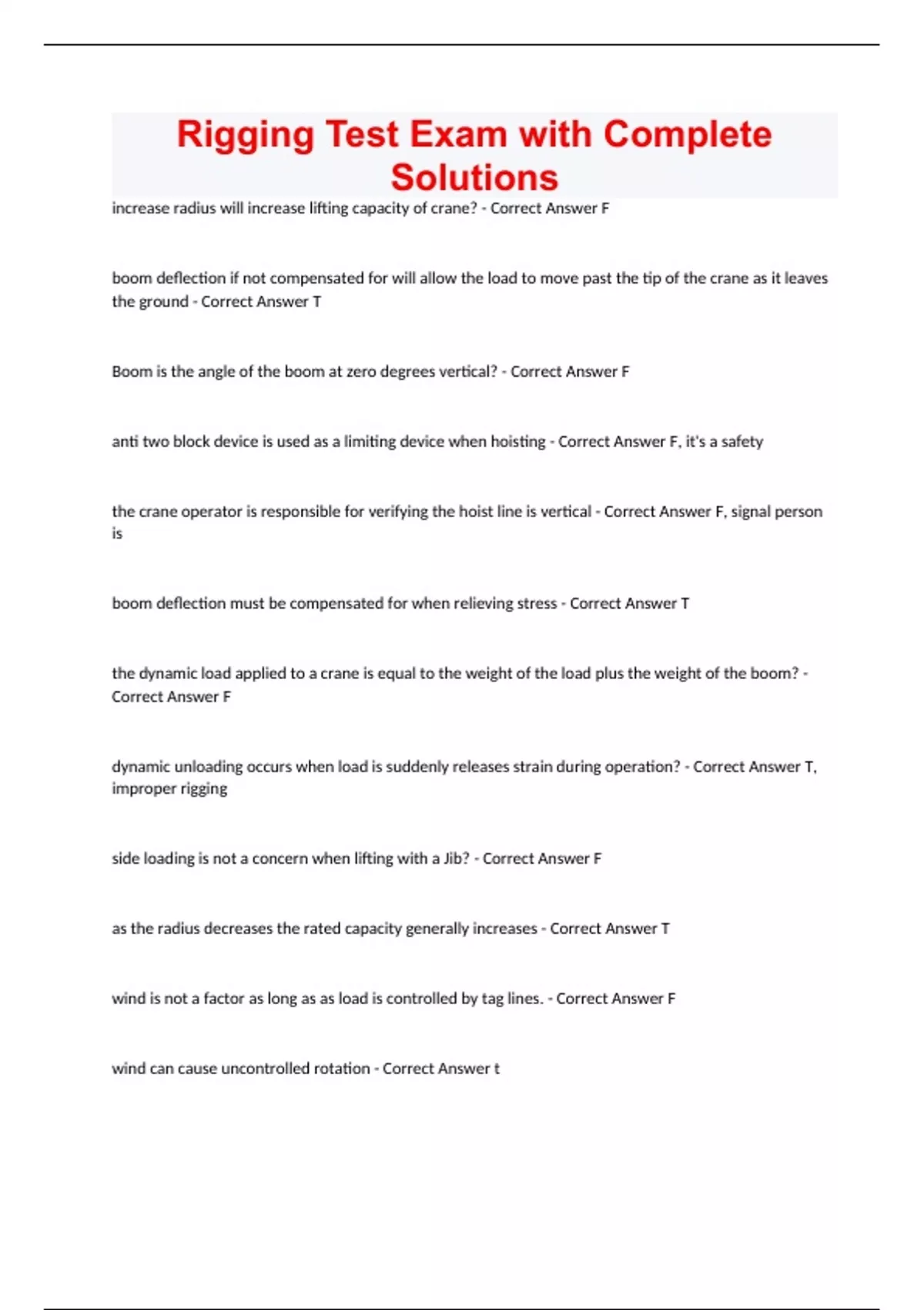 Rigging Test Exam with Complete Solutions increase radius will increase lifting capacity of crane? - Correct Answer F boom deflection if not compensated for will allow the load to move past the tip of the crane as it leaves the ground - Correct Answer T Boom is the angle of the boom at zero degrees vertical? - Correct Answer F anti two block device is used as a limiting device when hoisting - Correct Answer F, it's a safety the crane operator is responsible for verifying the hoist line is vertical - Correct Answer F, signal person is boom deflection must be compensated for when relieving stress - Correct Answer T the dynamic load applied to a crane is equal to the weight of the load plus the weight of the boom? - Correct Answer F dynamic unloading occurs when load is suddenly releases strain during operation? - Correct Answer T, improper rigging side loading is not a concern when lifting with a Jib? - Correct Answer F as the radius decreases the rated capacity generally increases - Correct Answer T wind is not a factor as long as as load is controlled by tag lines. - Correct Answer F wind can cause uncontrolled rotation - Correct Answer t