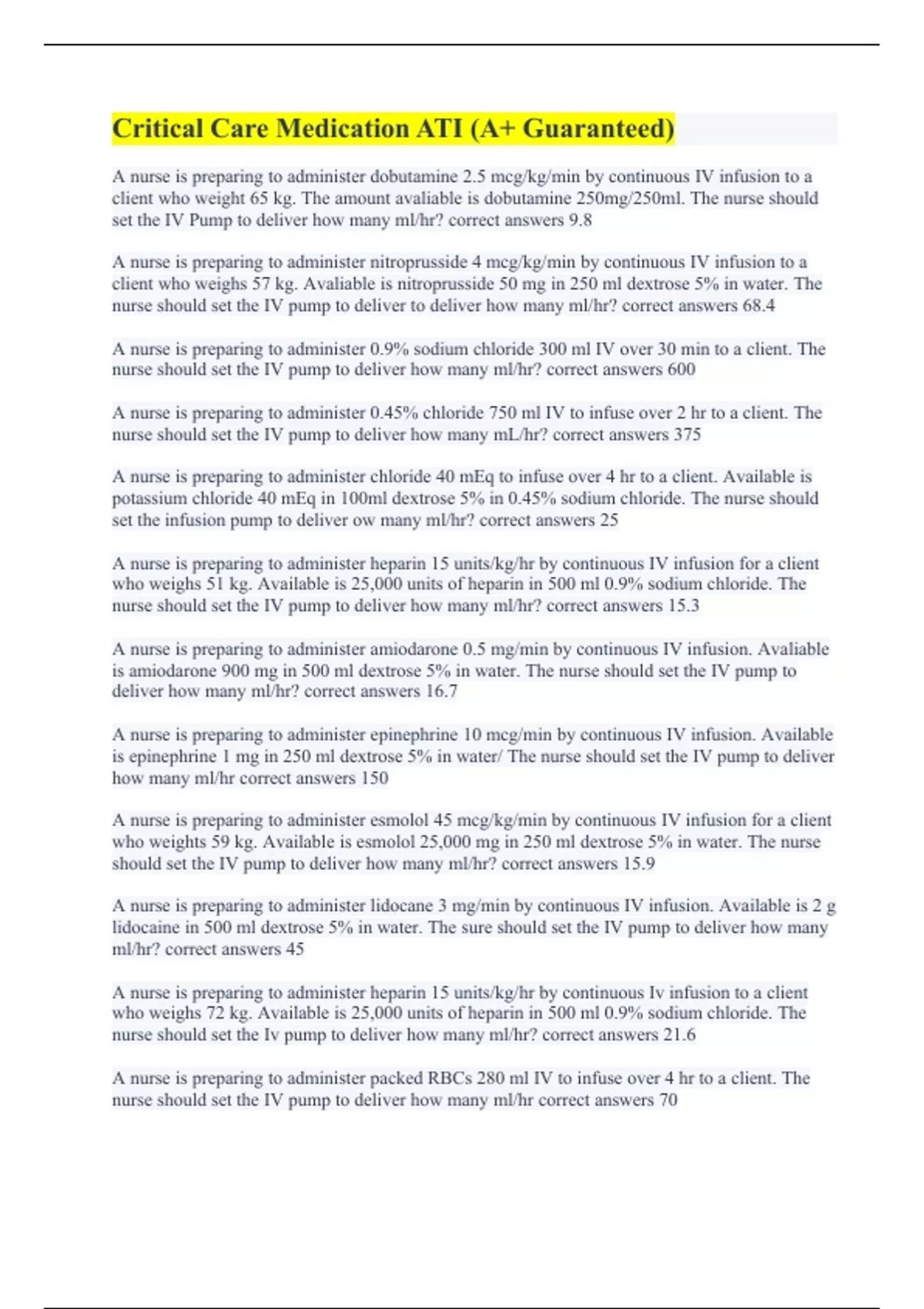 A nurse is preparing to administer nitroprusside 4 mcg/kg/min by continuous IV infusion to a client who weighs 57 kg. Avaliable is nitroprusside 50 mg in 250 ml dextrose 5% in water. The nurse should set the IV pump to deliver to deliver how many ml/hr? correct answers 68.4