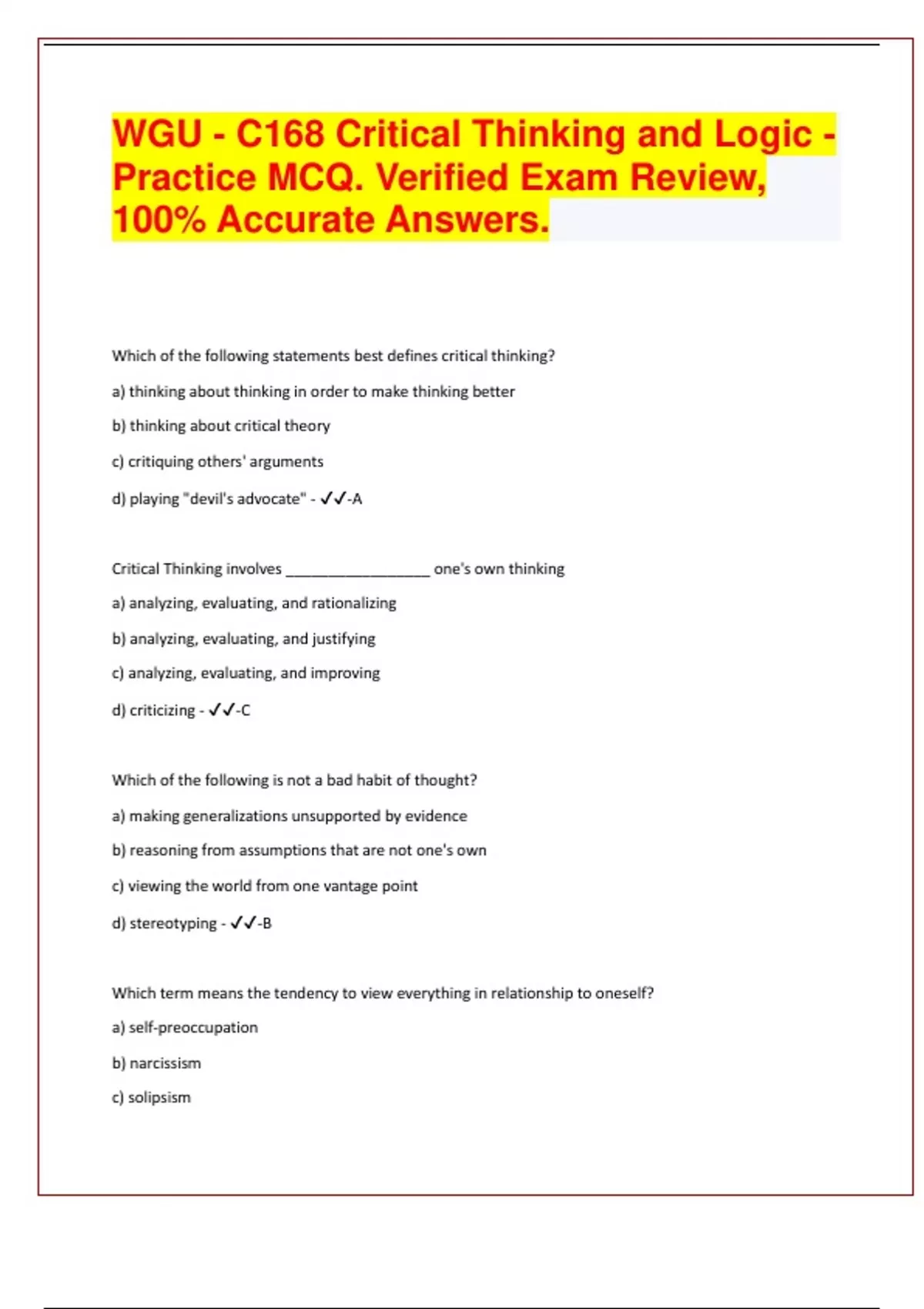 WGU - C168 Critical Thinking and Logic - Practice MCQ. Verified Exam Review, 100% Accurate Answers.