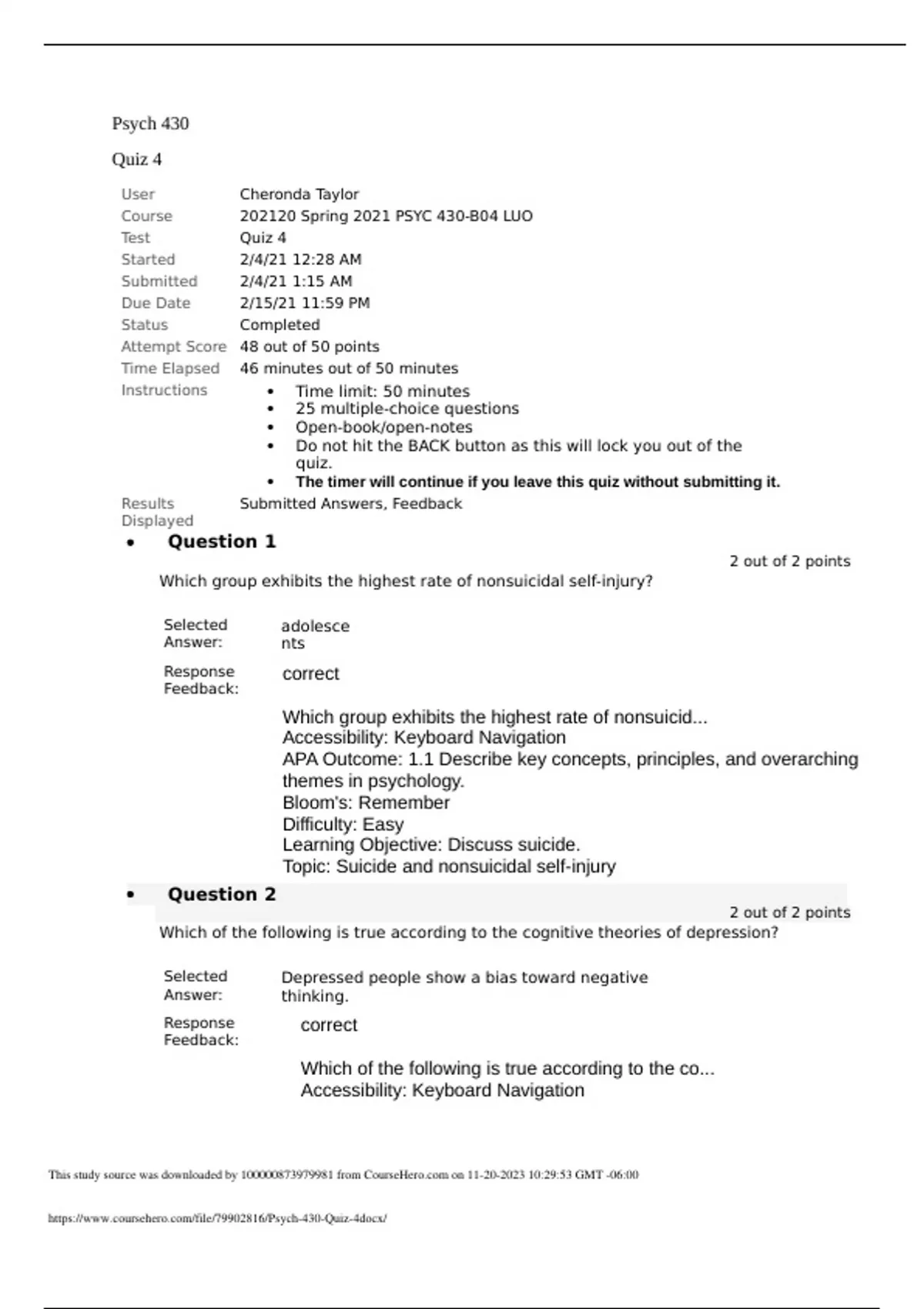 Psyc 430 Quiz & Final Exams | Questions and Verified Answers (2023/ 2024 Update)