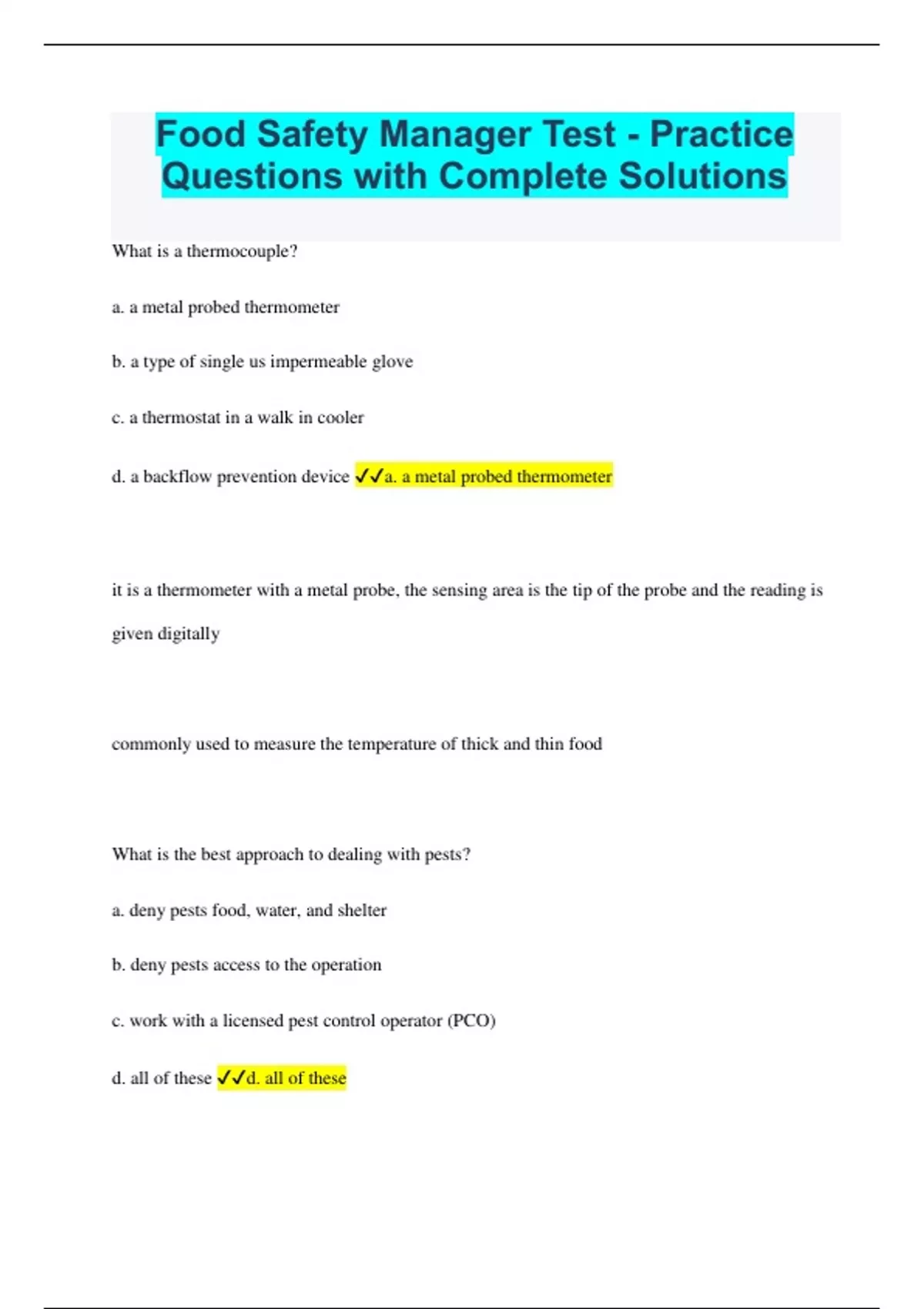 Food Safety Manager Test - Practice Questions with Complete Solutions What is a thermocouple? a. a metal probed thermometer b. a type of single us impermeable glove c. a thermostat in a walk in cooler d. a backflow prevention device a. a metal probed thermometer it is a thermometer with a metal probe, the sensing area is the tip of the probe and the reading is given digitally commonly used to measure the temperature of thick and thin food What is the best approach to dealing with pests? a. deny pests food, water, and shelter b. deny pests access to the operation c. work with a licensed pest control operator (PCO) d. all of these d. all of these prevention is critical when dealing with pests bc once there in an infestation, it can be difficult to deal with How should a cloth used for wet wiping be stored? a. hang wet clothes in an area that prevents dripping onto contact surfaces b. store them dry and only mix with a sanitizing solution before each use c. never reuse wet wipe clothes without washing them first d. in a bucket of sanitizing solution d. in a bucket of sanitizing solution Which of the following is NOT considered a safe way to thaw frozen meat? a. cooking it while still frozen b. in a microwave c. in a walk in cooler d. under hot running water d. under hot running water it is not safe to thaw frozen meat with water above 70 degrees F, this is because the outside of the meat will enter the temperature danger zone while the inside will still be frozen what is the FIFO method? (first in, first out) a. washing hands before and after each task b. storing food items so that the oldest is used first c. marking packaged food items with a use-by date d. rotating food pans on a buffet line so that the food remains fresh b. storing food items so that the oldest is used first because all food becomes less safe over time, it makes sense to use the old food first What is an example of a physical contaminant? a. bones in chili b. mold on cheese c. chicken juices on a cutting board d. pathogens on unwashed hands a. bones in chili there are three types of containments that can enter food: physical, biological and chemical a physical contaminant refers to things such as glass, dirt, or bones for example that can contaminate food Why must ground meats be cooked to a higher temperature than whole cuts of meat? a. more pathogens reside on the outside of the meat and grinding redistributes the pathogens throughout the meat b. air pockets within the ground meat may prevent it from cooking evenly c. overcooking a whole cut of meat may result in a burnt texture on the surface of the meat d. the grinder used to process ground meats has a higher likelihood of harboring pathogens a. more pathogens reside on the outside of the meat and grinding redistributes the pathogens throughout the meat If a TCS food will be hot held for service, what is the minimum internal temperature that this food must maintain while being held? a. 135 F b. 145 F c. 41 F d. 165 F a. 135 F Which unused items may be reserved to another customer?