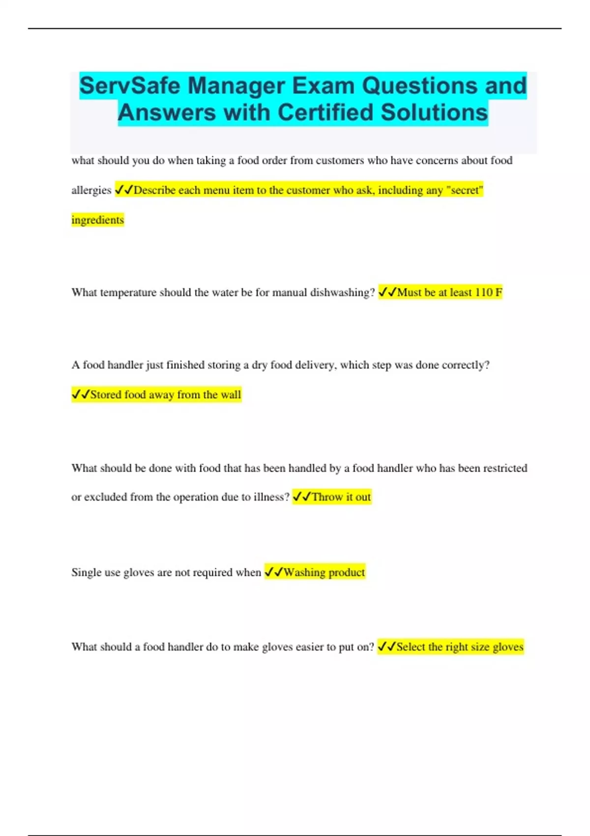 ServSafe Manager Exam Questions and Answers with Certified Solutions what should you do when taking a food order from customers who have concerns about food allergies Describe each menu item to the customer who ask, including any "secret" ingredients What temperature should the water be for manual dishwashing? Must be at least 110 F A food handler just finished storing a dry food delivery, which step was done correctly? Stored food away from the wall What should be done with food that has been handled by a food handler who has been restricted or excluded from the operation due to illness? Throw it out Single use gloves are not required when Washing product What should a food handler do to make gloves easier to put on? Select the right size gloves What should food handlers do after leaving and returning to the prep area? Wash hands What rule for serving bread should food handlers practice? Do not re-serve uneaten bread What does the L stand for in the FDA'S ALERT tool? Look What is the minimum internal cooking temp for chicken breasts? 165°F (74 °C) for 15 seconds What factors influence the effectiveness of a chemical sanitizer? Concentration,temperature,contact time, pH and water hardness. Ready to eat TCS foods prepped in house must be date marked if it is held for more than how many hours? 24 Hours What is the minimum internal cooking temperature for a veal chop? 135°F(57 °C) Why should food temperature be taken in 2 different locations? Temperature may vary in the food What causes Preschool age children to be at risk for foodborne illness? Their immune systems are not strong How should staff make sure the chemical sanitizer being used on a food prep surface is at the correct strength? Use a test kit to check the sanitizers concentration when mixing it When can a glass thermometers be used? When enclosed in a shatter proof casing A tuna salad removed from the cooler at 9 am and put out for a buffet at 11 am. By what time must the tuna salad be served or thrown out? 3 p, What practice should be used to prevent seafood toxins from causing foodborne illness? Purchasing food from approved , reputable suppliers What should a server do after clearing a table? Wash hands What must food handlers do when handling ready to eat food? Wear single use gloves What is the first step in developing a HACCP plan? Conduct a hazard analysis A Food handler has cooled a container of chili to 70 degree F in 1 hour. How much time is left to cool the chili to 41? 5 Hours Nursing home staff are creating a new menu for a breakfast item for residents and their family members. What item is not safe to serve? Soft boiled eggs What practice is useful for preventing Norovirus from causing foodborne illness? Correct handwashing What condition promotes the growth of bacteria? FoOd helb between 70 degrees F and 125 degrees F What is the purpose of hand antiseptic? Lower the number of pathogens on the skin A food handler is prepping a seafood dish on April 4, using shrimp and scallops. The shrimp has a use-by date of April 8, and the scallops have a use-by date of April 10. What is the use-by date for the seafood dish? When can a food handler diagnosed with jaundice return to work? When approved by the regulatory authority Parasites are commonly associated with what food? Wild game When should a food handler with a sore throat and fever be excluded from the operation? When the customers served are primarily a high-risk population Which organization includes inspecting food as one of its primary responsibilities? U.S. Department of Agriculture What must an operation do before packaging fresh juice on-site for later sale? Obtain a variance Which item is a potential physical contaminant? Jewelry What strategy can prevent cross-contamination? Buy food that does not require prepping