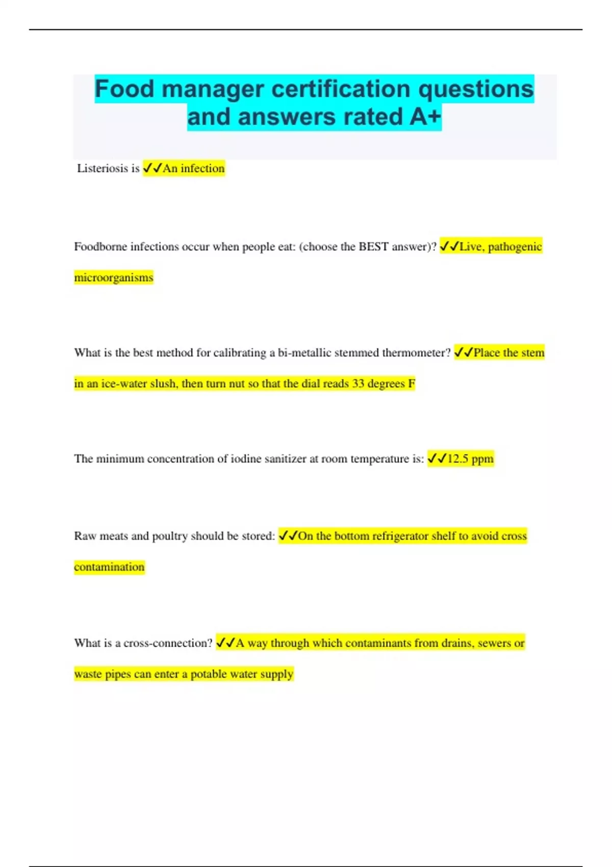 Food manager certification questions and answers rated A+ Listeriosis is An infection Foodborne infections occur when people eat: (choose the BEST answer)? Live, pathogenic microorganisms What is the best method for calibrating a bi-metallic stemmed thermometer? Place the stem in an ice-water slush, then turn nut so that the dial reads 33 degrees F The minimum concentration of iodine sanitizer at room temperature is: 12.5 ppm Raw meats and poultry should be stored: On the bottom refrigerator shelf to avoid cross contamination What is a cross-connection? A way through which contaminants from drains, sewers or waste pipes can enter a potable water supply From a sanitation perspective, which are considered the most dangerous to a foodservice establishment? Mice Which would be most dangerous? Ground beef stored above ready-to-eat foods in the refrigerator Hand sanitizers: Only work on clean hands What is a sign that a shipment of fish is of UNACCEPTABLE quality? The eyes are sunken and cloudy What is the minimum cooking temperature for ground turkey? 165 degrees F The BEST reason to air dry dishes and utensils is: To give the sanitizer time to break down biofilms HACCP stands for Hazard Analysis Critical Control Point If a customer spills hot food on the floor, the first thing to do is: Have a co-worker stand by the spill to warn people Which of the following is a virus? Hepatitis A Most potentially hazardous foods have a pH level between: 4.6 - 10 17. Staphylococcus aureus is most often transmitted by: A food handler with an uncovered sore on his hand Which of the following foods is potentially hazardous? C. Fresh, raw seed sprouts Which of the following is NOT an approved thawing method? C. In a covered sanitary pan at 75 degrees F Bacterial spores: . May survive correct minimum cooking and freezing temperatures