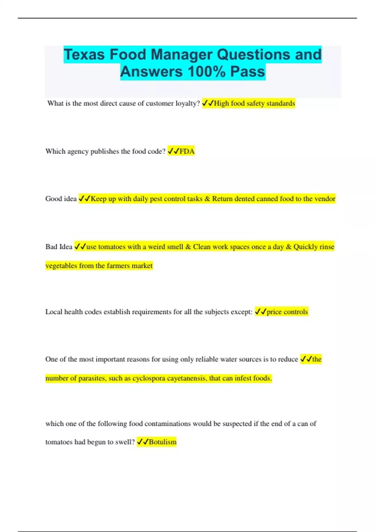 Texas Food Manager Questions and Answers 100% Pass What is the most direct cause of customer loyalty? High food safety standards Which agency publishes the food code? FDA Good idea Keep up with daily pest control tasks & Return dented canned food to the vendor Bad Idea use tomatoes with a weird smell & Clean work spaces once a day & Quickly rinse vegetables from the farmers market Local health codes establish requirements for all the subjects except: price controls One of the most important reasons for using only reliable water sources is to reduce the number of parasites, such as cyclospora cayetanensis, that can infest foods. which one of the following food contaminations would be suspected if the end of a can of tomatoes had begun to swell? Botulism All of the following bacteria can cause foodborne illness except? Acidophilus milk Which of the following situations would most likely promote bacterial contamination? slicing roast beef and then slicing brisket with the same knife What is the easiest way to recognize foods contaminated with spoilage bacteria? Changes in color and smell The viral infection hepatitis a can be most effectively controlled if: All food personnel practice personal hygiene such as through handwashing Which bacteria cause the greatest harm in the food industry? Pathogenic Which one of the following food contaminations is usually associated with undercooked chicken? Salmonella An organism that lives in or another organism often with harmful side effects but without benefits are Virus Which one of the following food contaminations is best prevented by cooking to safe temperatures? Spoilage Salmonella Any food item that is exposed to animal waste may contain it. Symptoms may include fever and abdominal cramps. hepatitis A A liver disease that is caused by the virus and can be prevented with proper sanitation and good personal hygiene. Escherichia (E.) Coli The primary symptoms of this bacterium is diarrhea and it can be prevented by cooking at safe temperatures. Norovirus The virus is also known as 'Stomach Flu' and the main symptoms include nausea, vomiting, and stomach. Shigella This bacterium has also been known to be spread by flies that have lit upon contaminated materials. Reheated