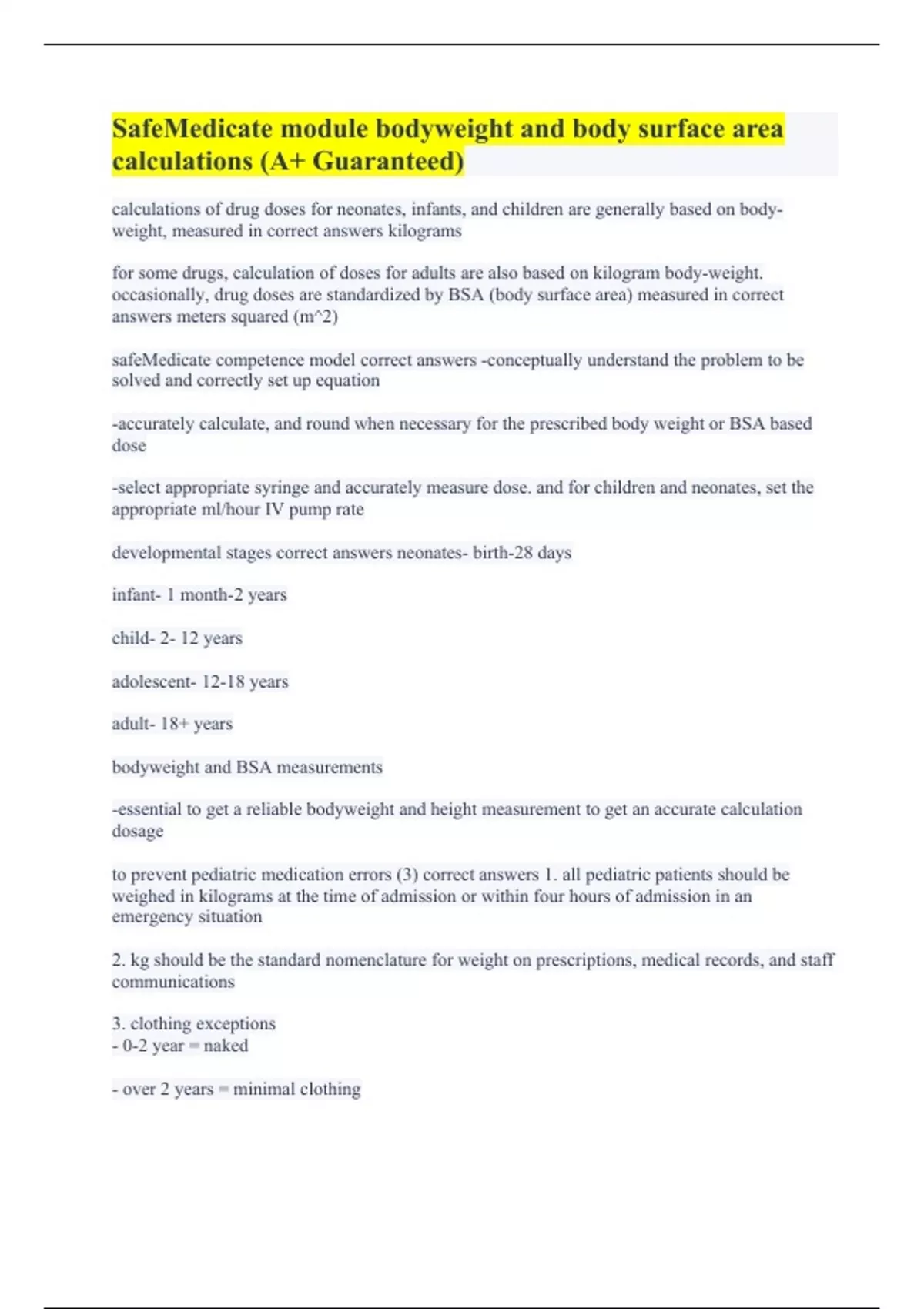 SafeMedicate module bodyweight and body surface area calculations (A+ Guaranteed)