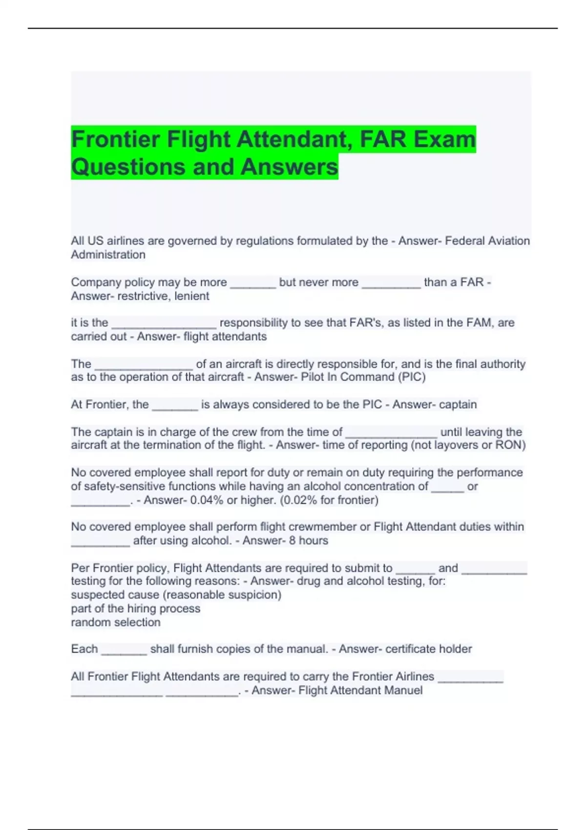 Frontier Flight Attendant, FAR Exam Questions and Answers Graded A